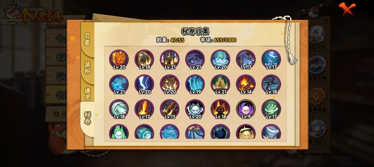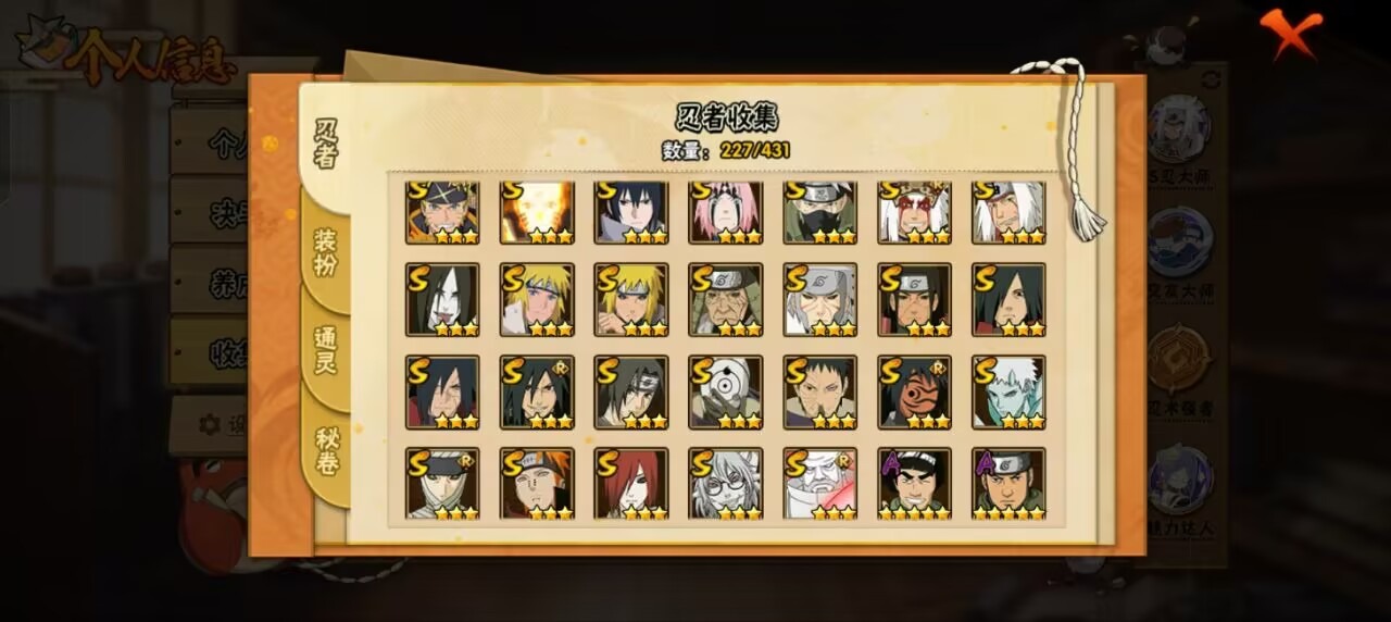 【S级忍者】宇智波斑「秽土转生·解」,宇智波佐助「永恒万花筒」,神秘面具男 「红夜之刃」,春野樱 「忍界大战」,大筒木金式「博人传」,漩涡鸣人 「九喇嘛连结」,宇智波带土 「忍界大战」,千手柱间「秽土转生」,自来也 「舞之豪杰」,旗木卡卡西「须佐能乎」,自来也 「传说中的三忍」,漩涡鸣人·宇智波佐助,宇智波带土「十尾人柱力」,宇智波斑「神驹佑将」,药师兜「仙人模式」,宇智波斑「白面具」,千手扉间「秽土转生」,波风水门