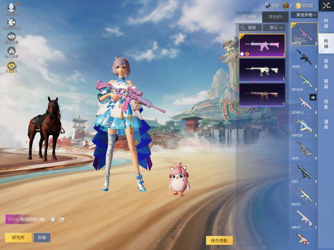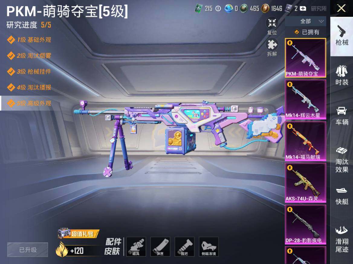 【粉色枪皮等级】:M416-电玩时刻(五级),AKS-74U-森灵之息(五级),Kar98K-巳巳如意(五级),Mk14-甜梦熊击(五级),Mk14-辉云木星(五级),Mk14-福马献瑞(二级),MK12-雪月幻音(四级),SPAS-