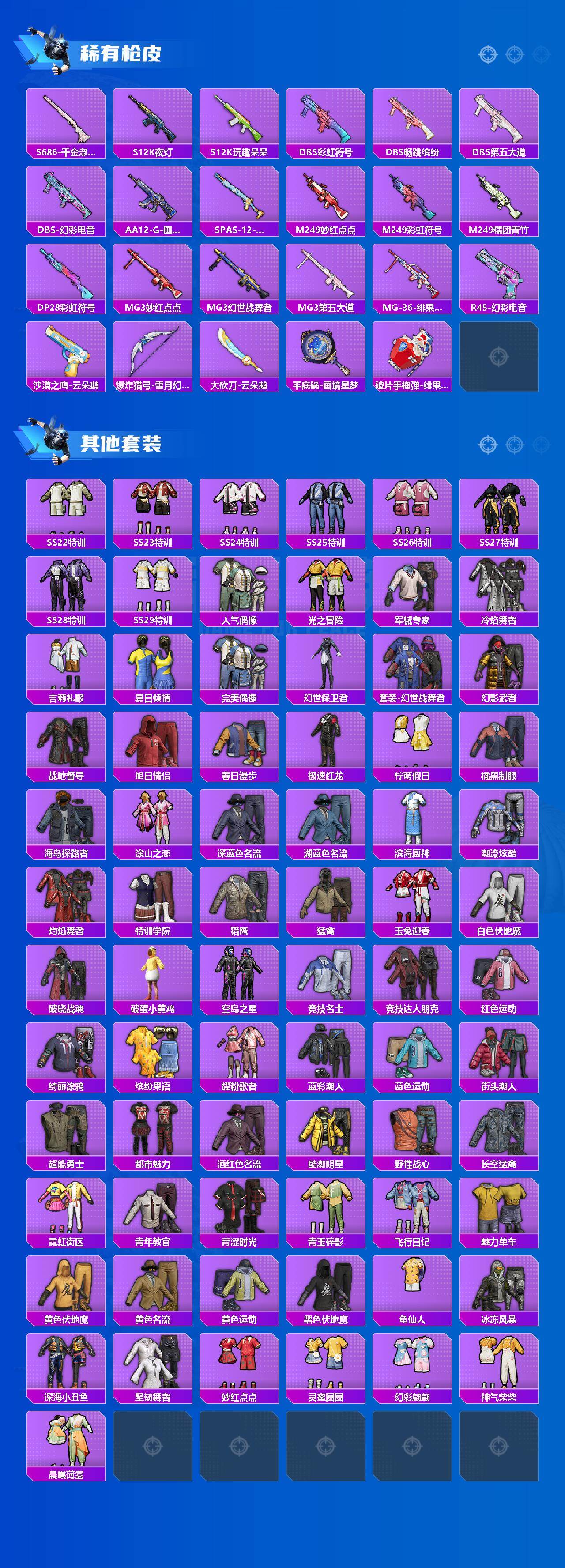 【粉色枪皮等级】:Kar98K-巳巳如意(五级),Mk14-樱桃泡泡(七级),Mk14-福马献瑞(四级),DP-28-豹影疾电(五级)