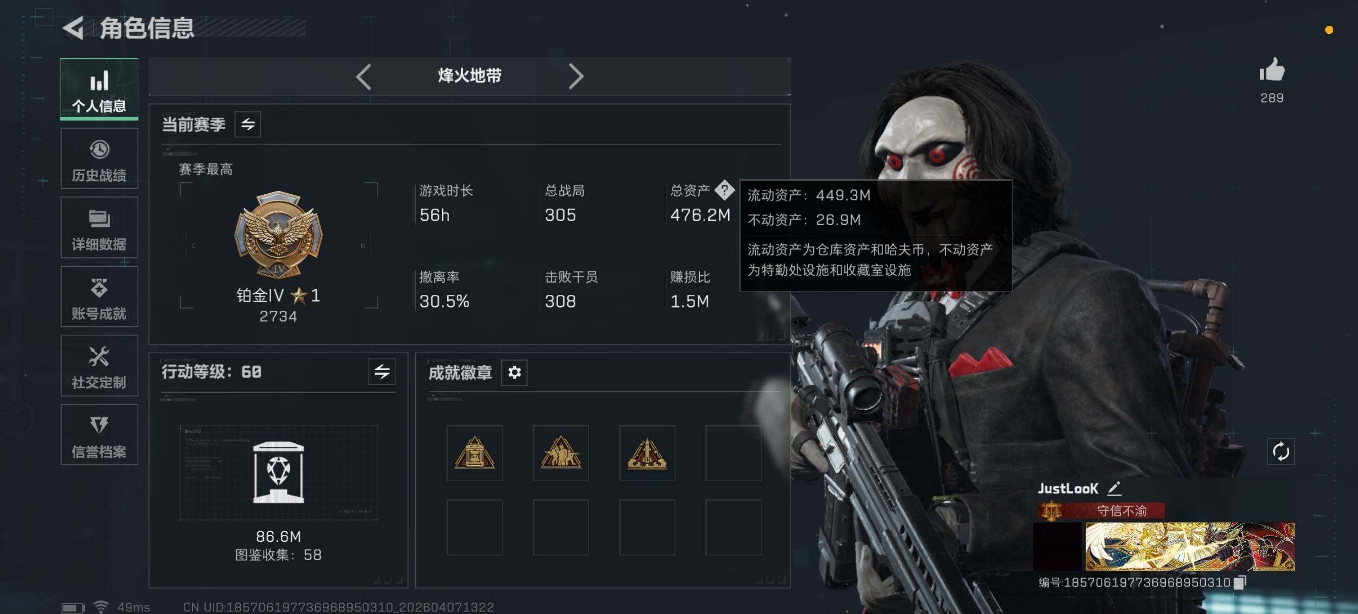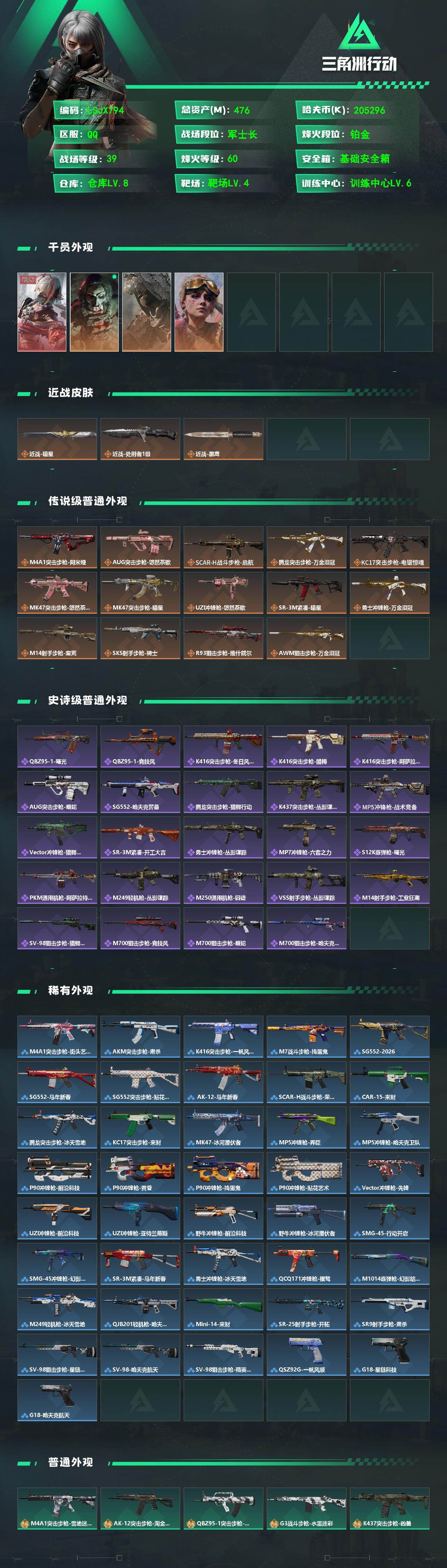 【特价出售/店主推荐】476m总资产-205296k哈夫币-60烽火等级-铂金-39战场等级-军士长