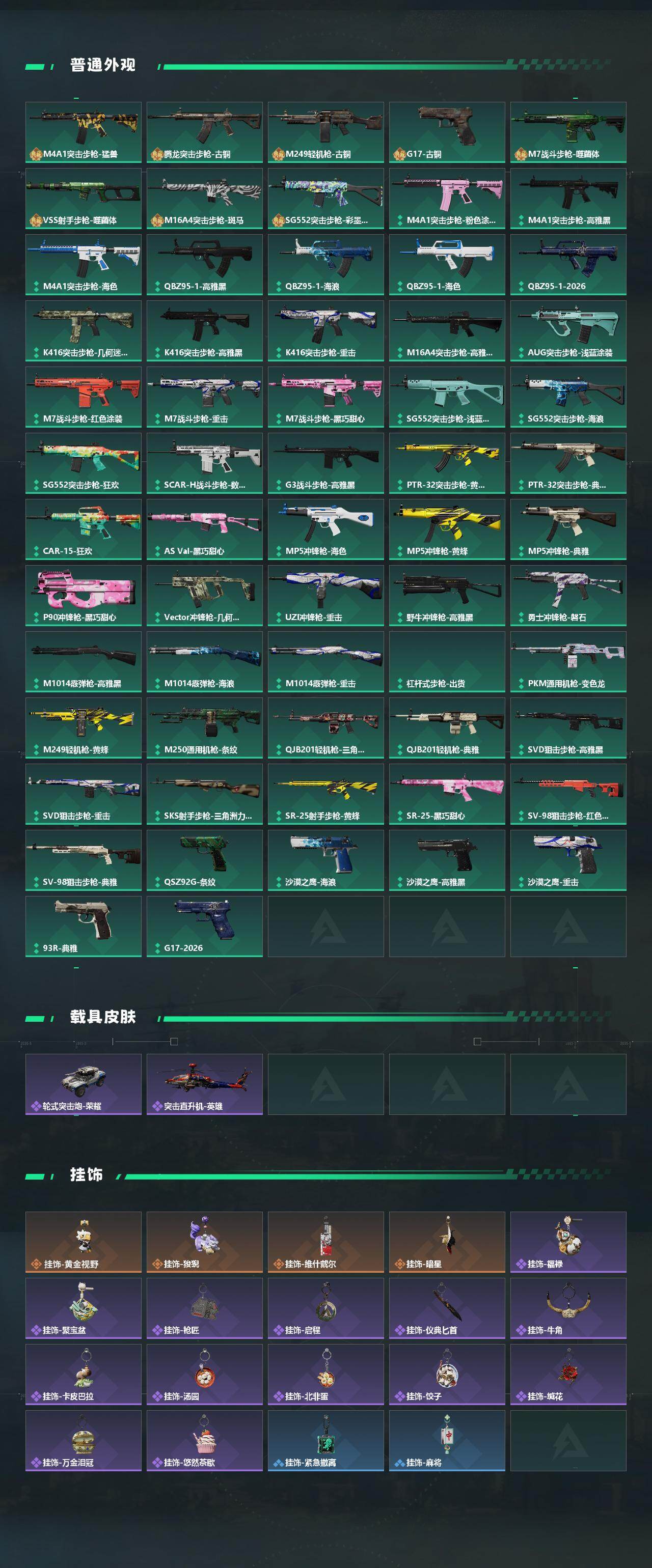 【传说外观】:M4A1突击步枪-阿米娅,AUG突击步枪-悠然茶歇,SCAR-H战斗步枪-启航,腾龙突击步枪-万金泪冠,KC17突击步枪-电锯惊魂,MK47突击步枪-悠然茶歇,MK47突击步枪-暗星,UZI冲锋枪-悠然茶歇,SR-3M紧凑突击步枪-暗星,勇士冲锋枪-