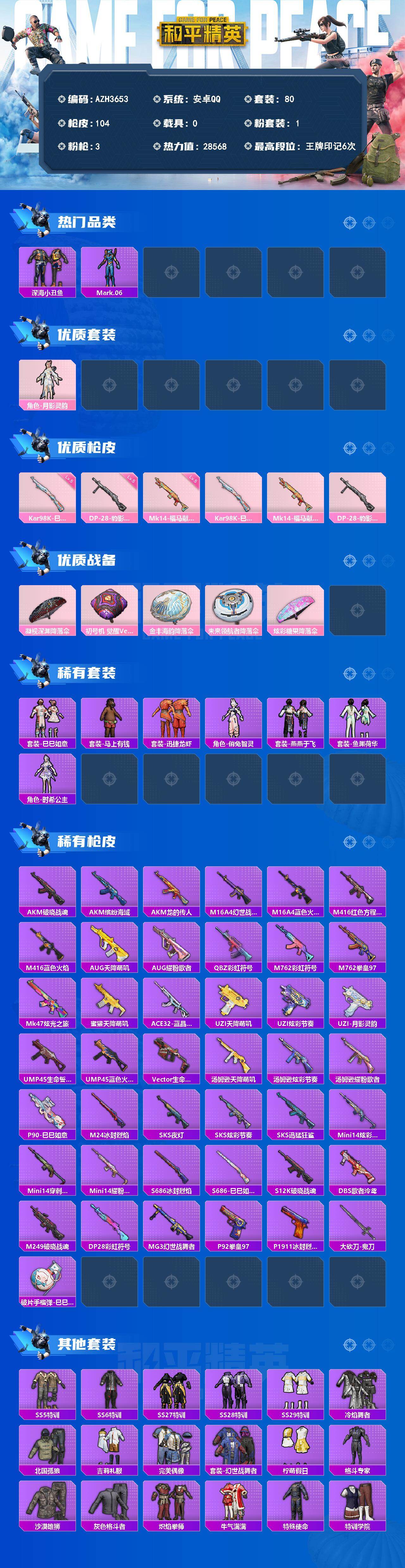 【AZH3653】安卓 手Q【深海小丑鱼】1粉装-3特效枪-0载具-0粉色飞行器-28568热力值-6王牌印记-80套装-104枪皮