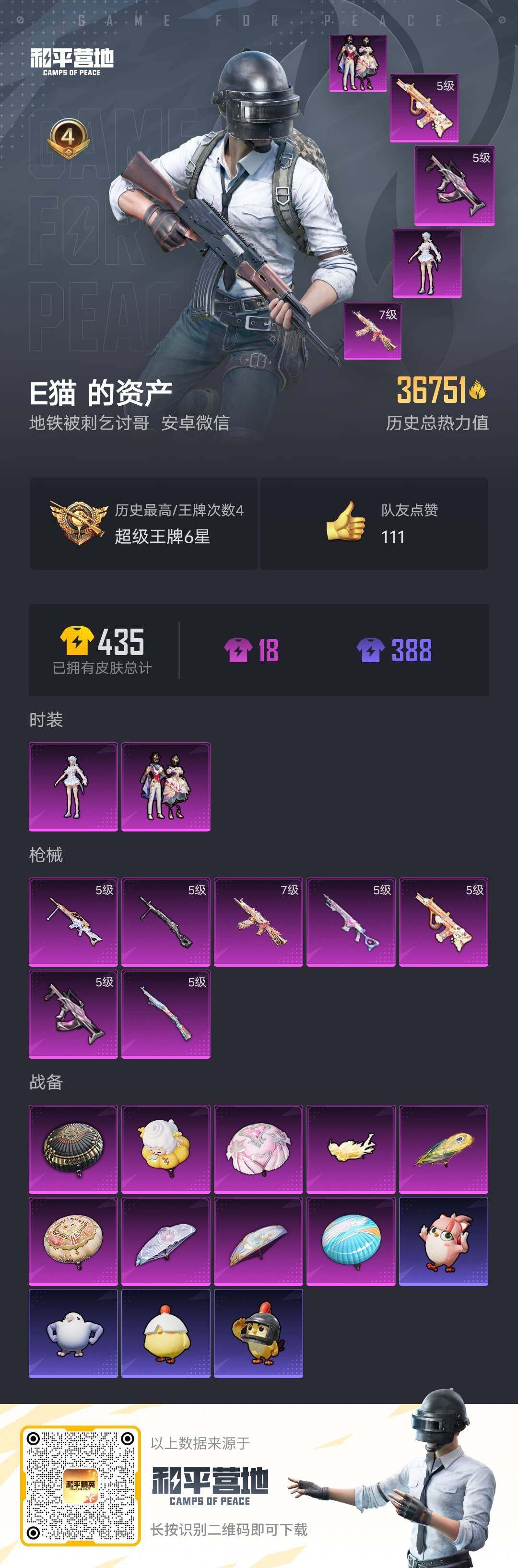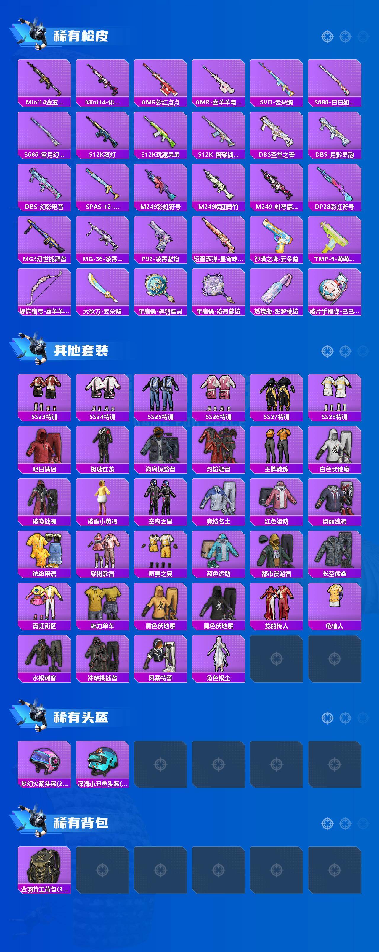 HJ6526 可二 游戏48级 2粉7枪 78套装138枪皮 4印记 【2粉装】 荧海星豚 星穹咏叹调 【7特效枪】 AKS-74U-星穹咏叹调 (7级) Kar98K-巳巳如意 (5级) MG-36-沧焰双生 (5级) DP-28-豹影疾电 (5级) AUG-暖羊咩咩 (5级) Mk14-甜梦熊击 (5级) GROZA-镜光银凌 (5级) 【7热门】 龟仙人 水银刺客 破蛋小黄鸡 极速红龙 AKM-奇异狩猎者 M762-奇异狩猎者 M24-奇异狩猎者 【1头盔】 深海小丑鱼头盔 【1背包】 金