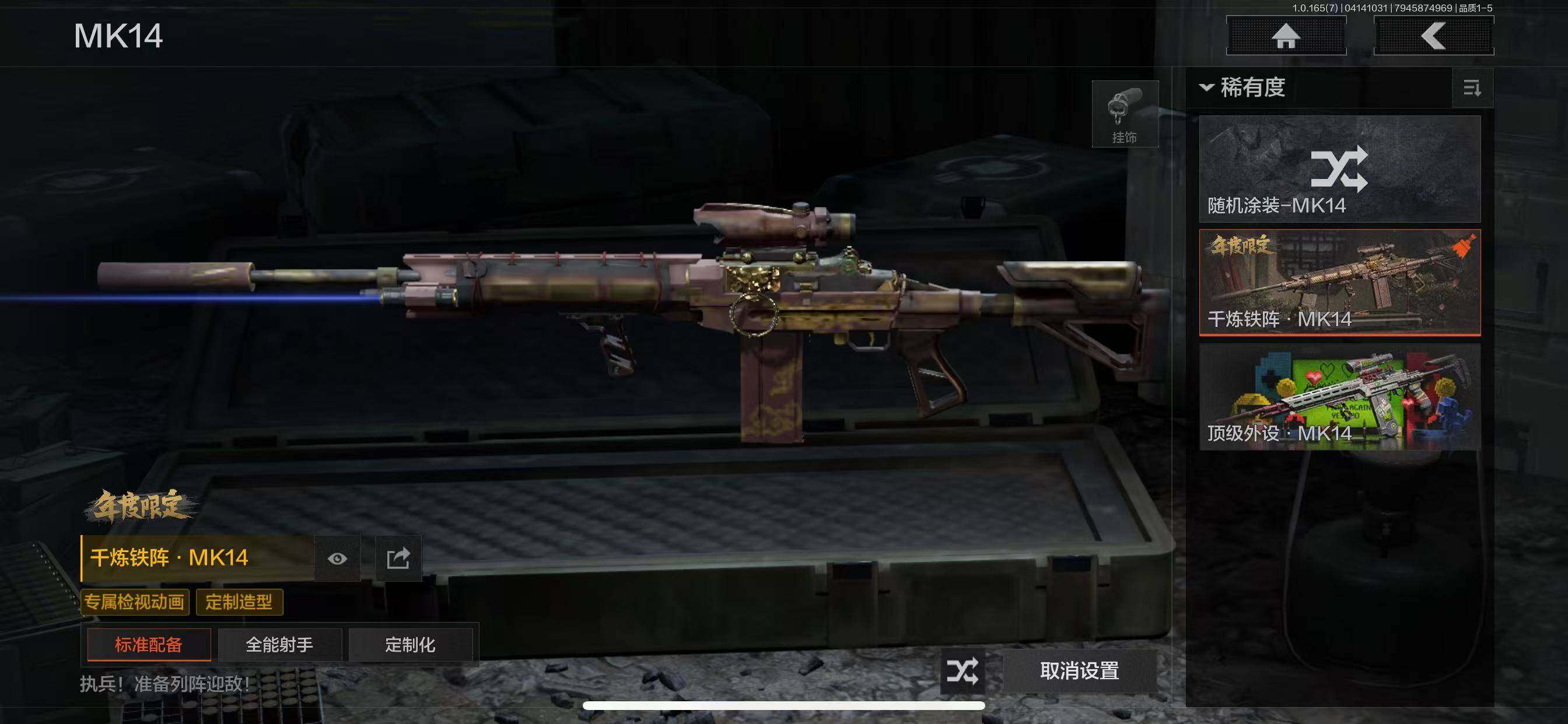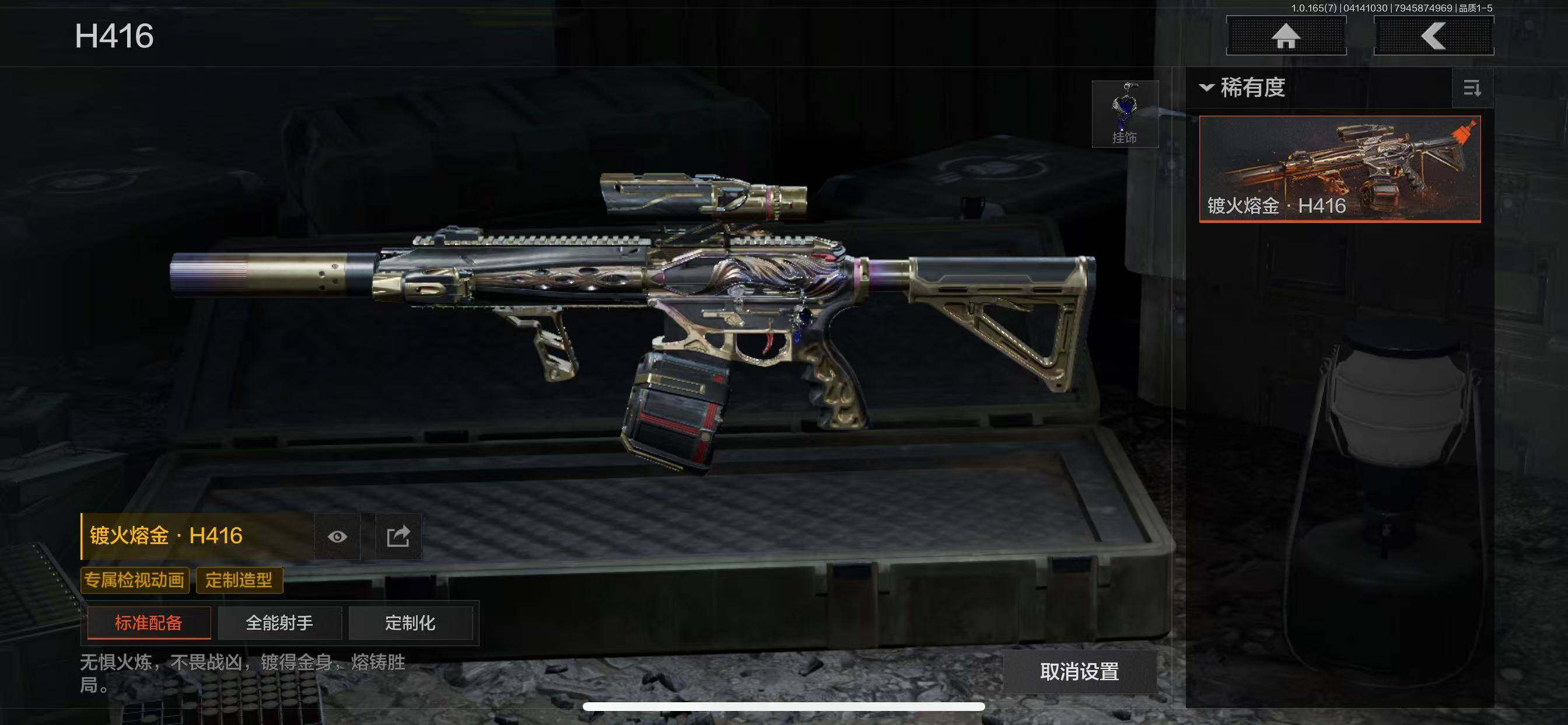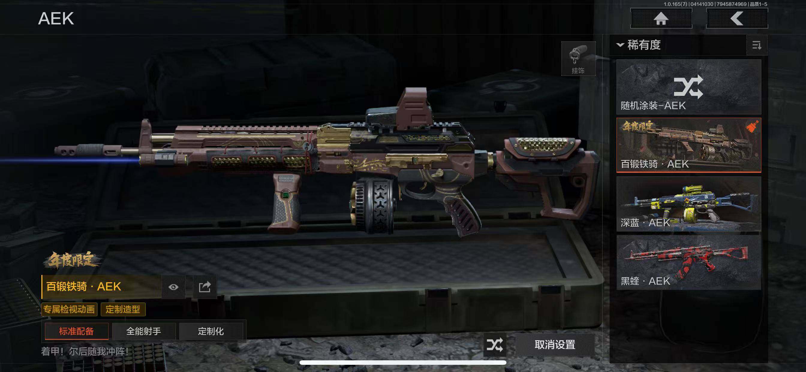金枪:林中人FAL,镀火熔金H416,赤帽要塞AR57,地脉深处ACE31,百锻铁骑AEK,玉擎天工AN94,战术大师T03,玉擎天工MP5,骑士之剑