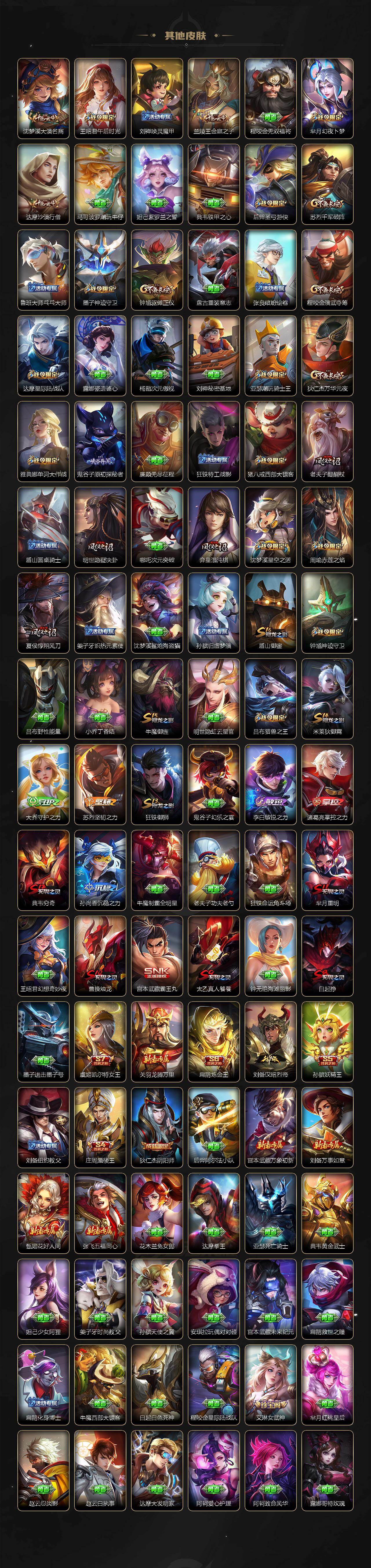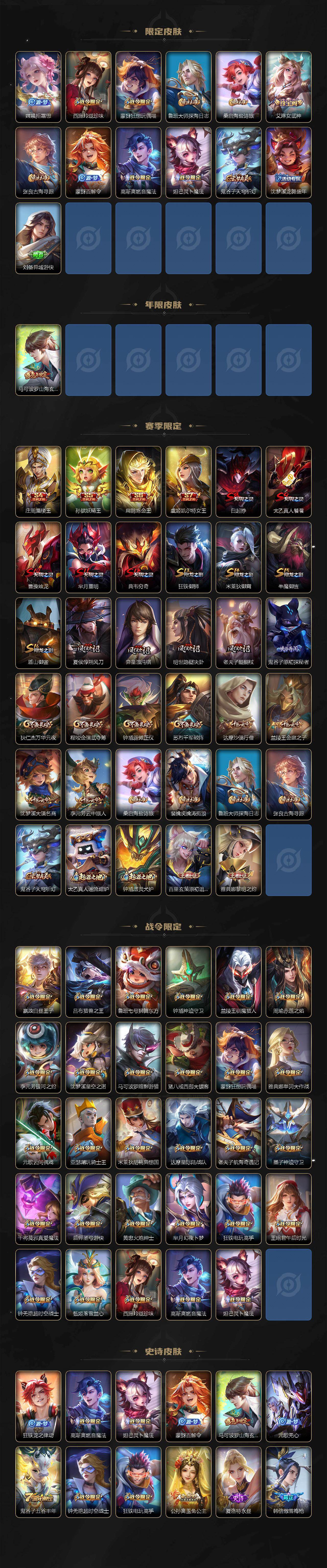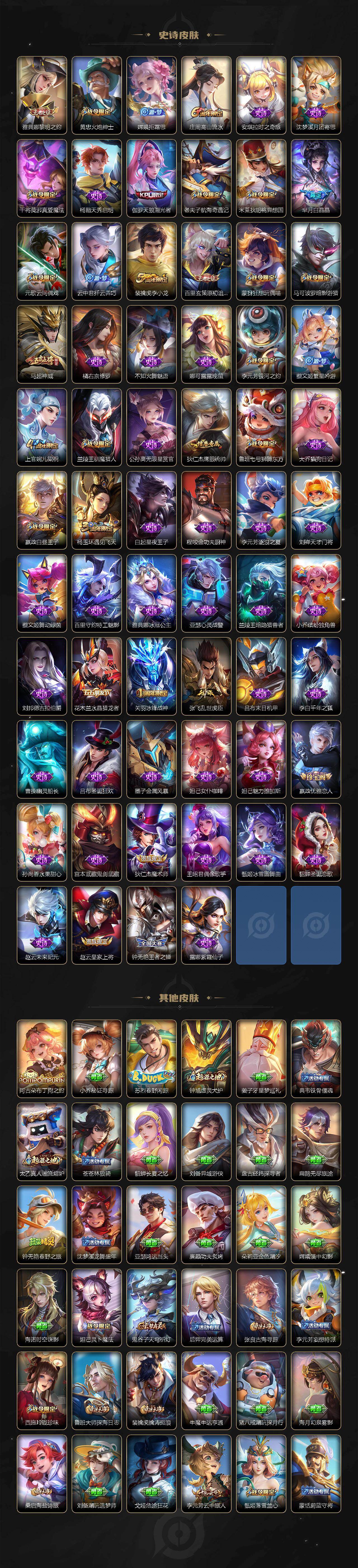 【传说皮肤】:孙策挚爱之约,孙尚香异界灵契,周瑜音你心动,镜炽阳神光,虞姬启明星使,曜云鹰飞将,花木兰冠军飞将,诸葛亮武陵仙君,貂蝉仲夏夜之梦