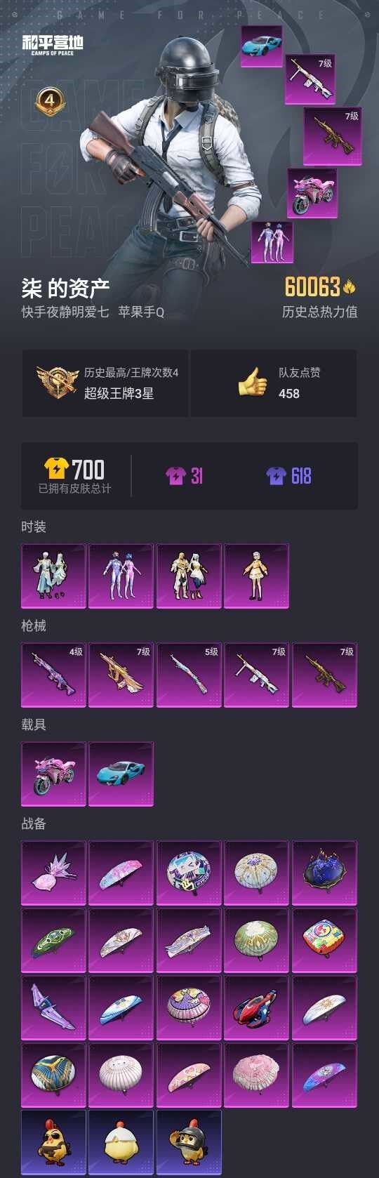 苹果 手Q-4粉装-5特效枪-2载具-3粉色飞行器-60063热力值-4王牌印记-144套装-191枪皮