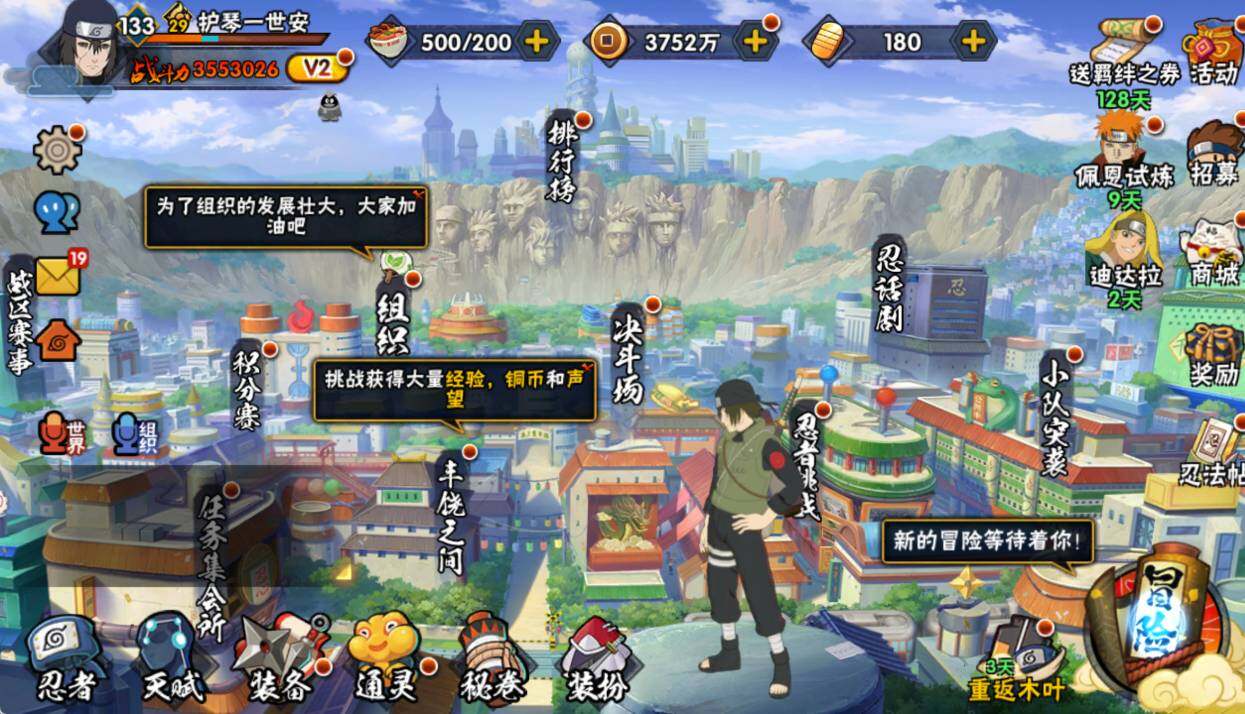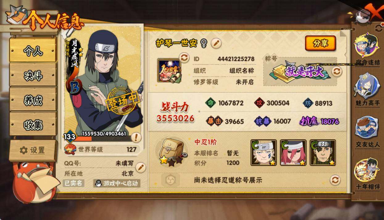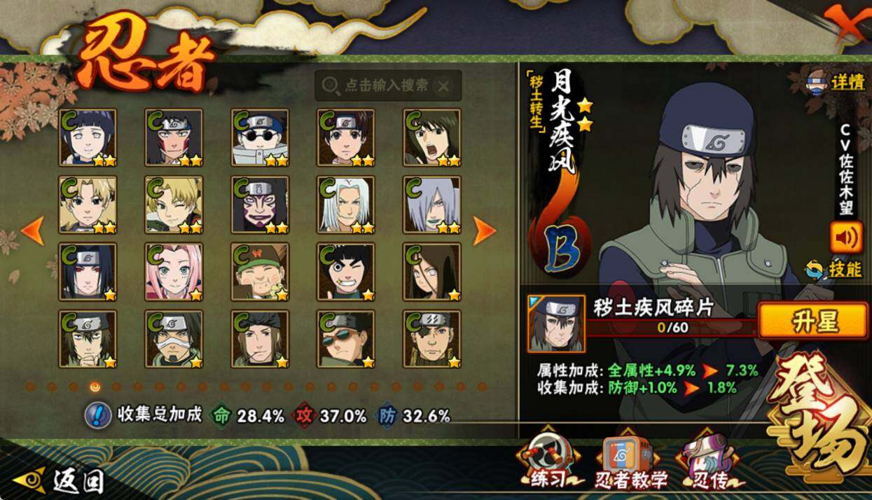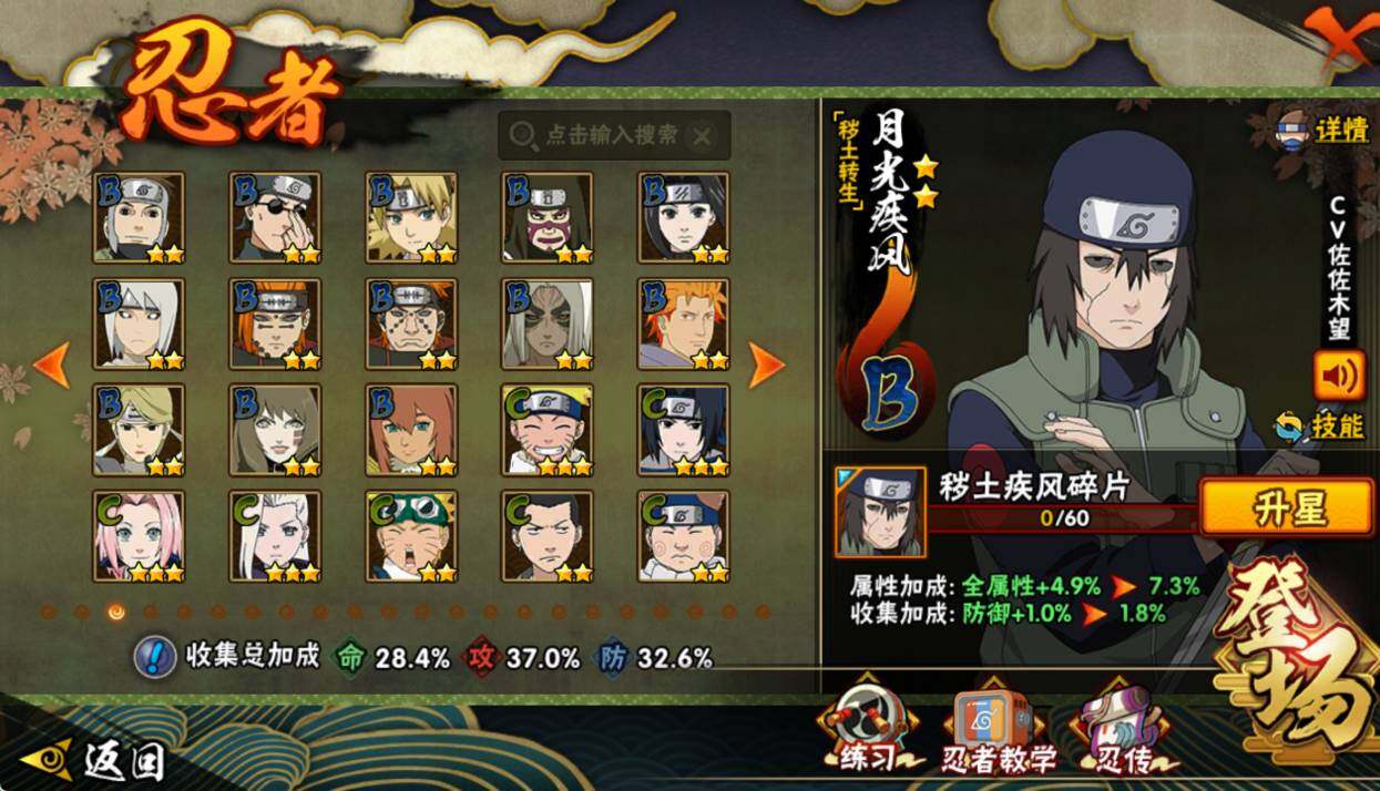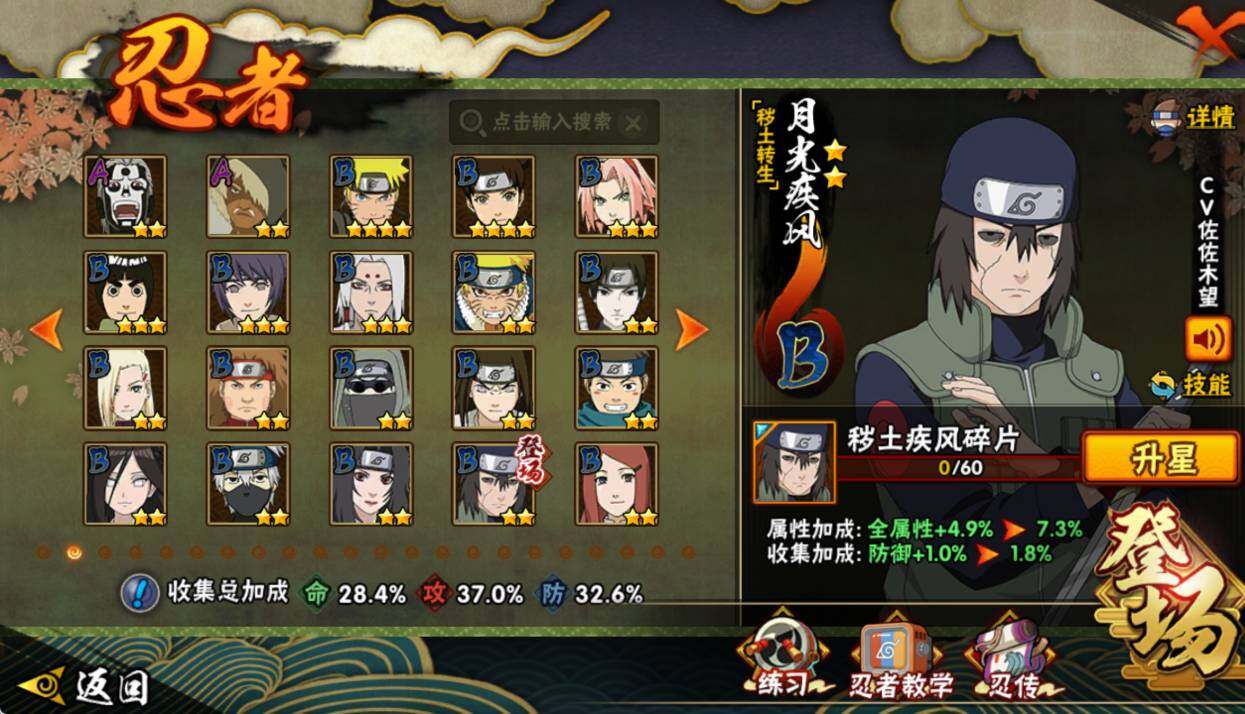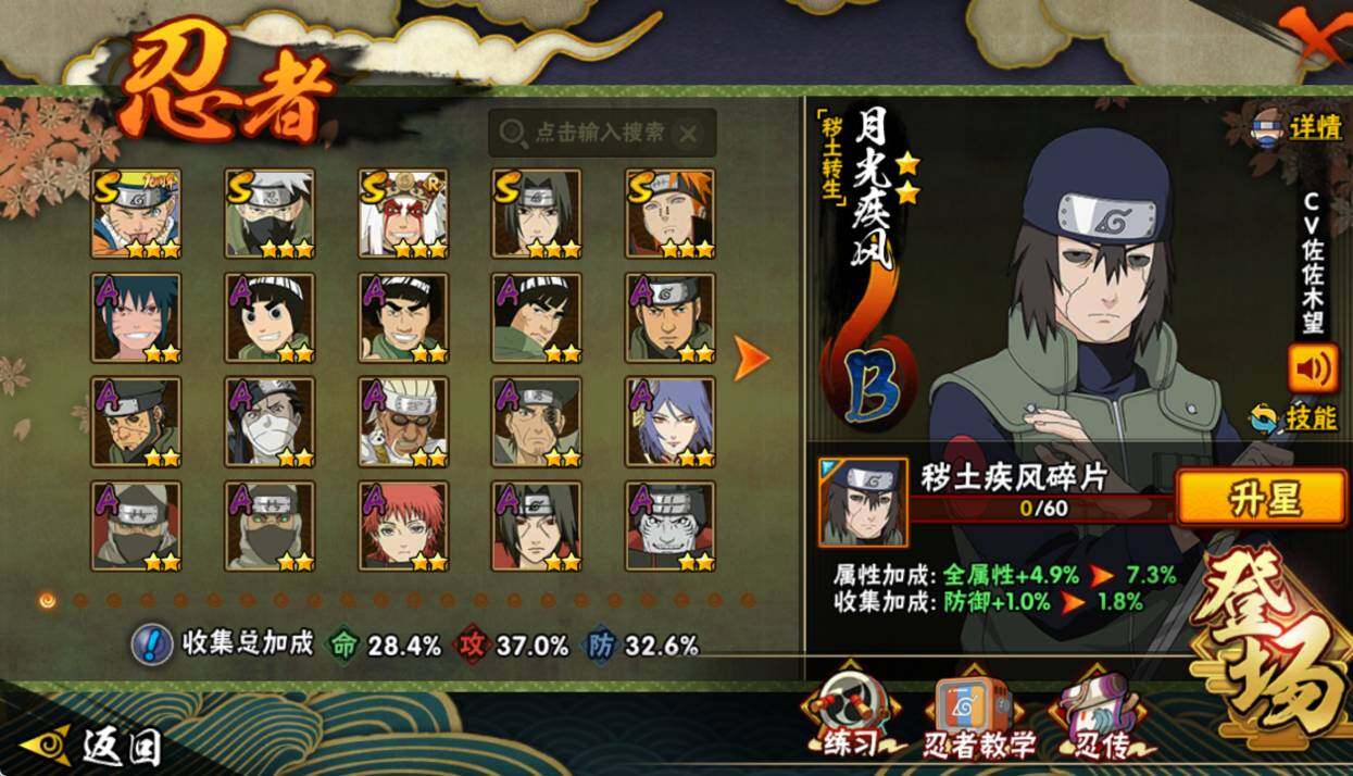 【S级忍者】:宇智波鼬「须佐能乎」(3星),旗木卡卡西「须佐能乎」(3星),自来也「舞之豪杰」(3星),佩恩「天道」(3星),漩涡鸣人·宇智波佐助(3星)