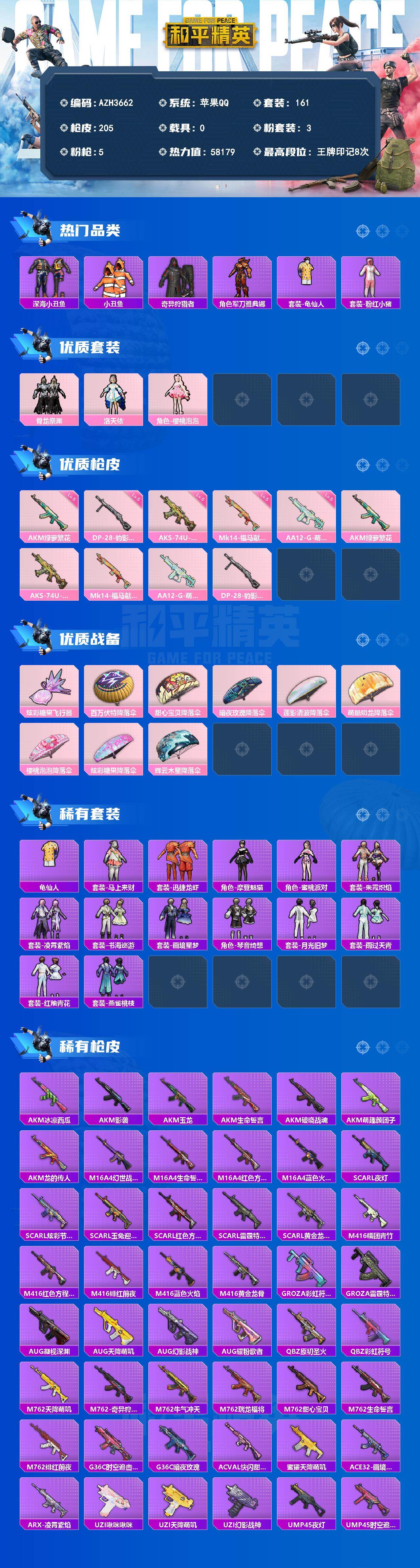 【AZH3662】苹果 手Q【樱桃泡泡 洛天依 深海小丑鱼 粉熊背包】3粉装-5特效枪-0载具-1粉色飞行器-58179热力值-8王牌印记-161套装-205枪皮