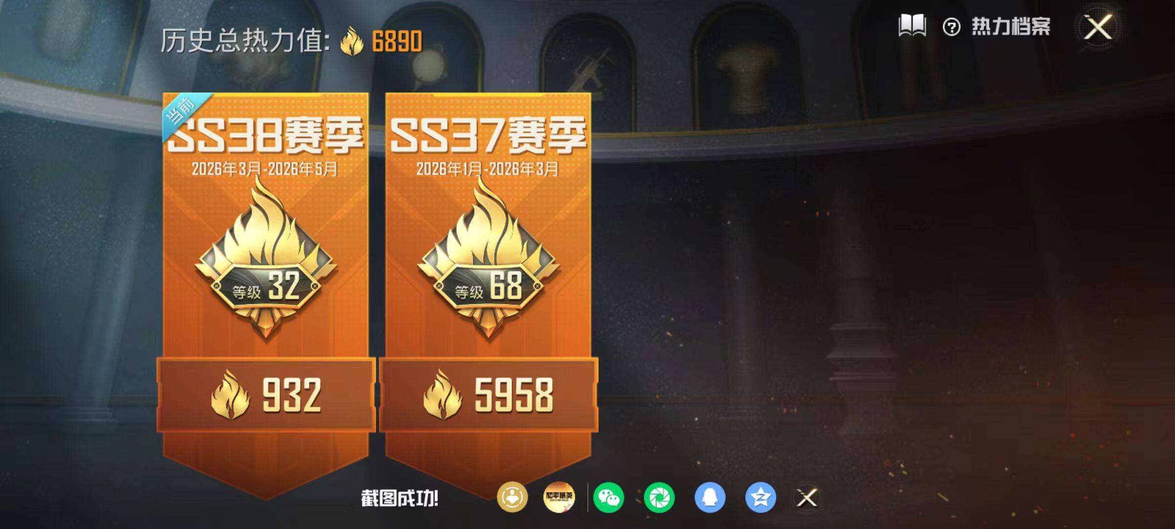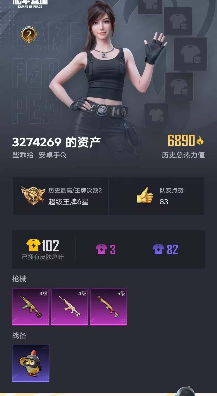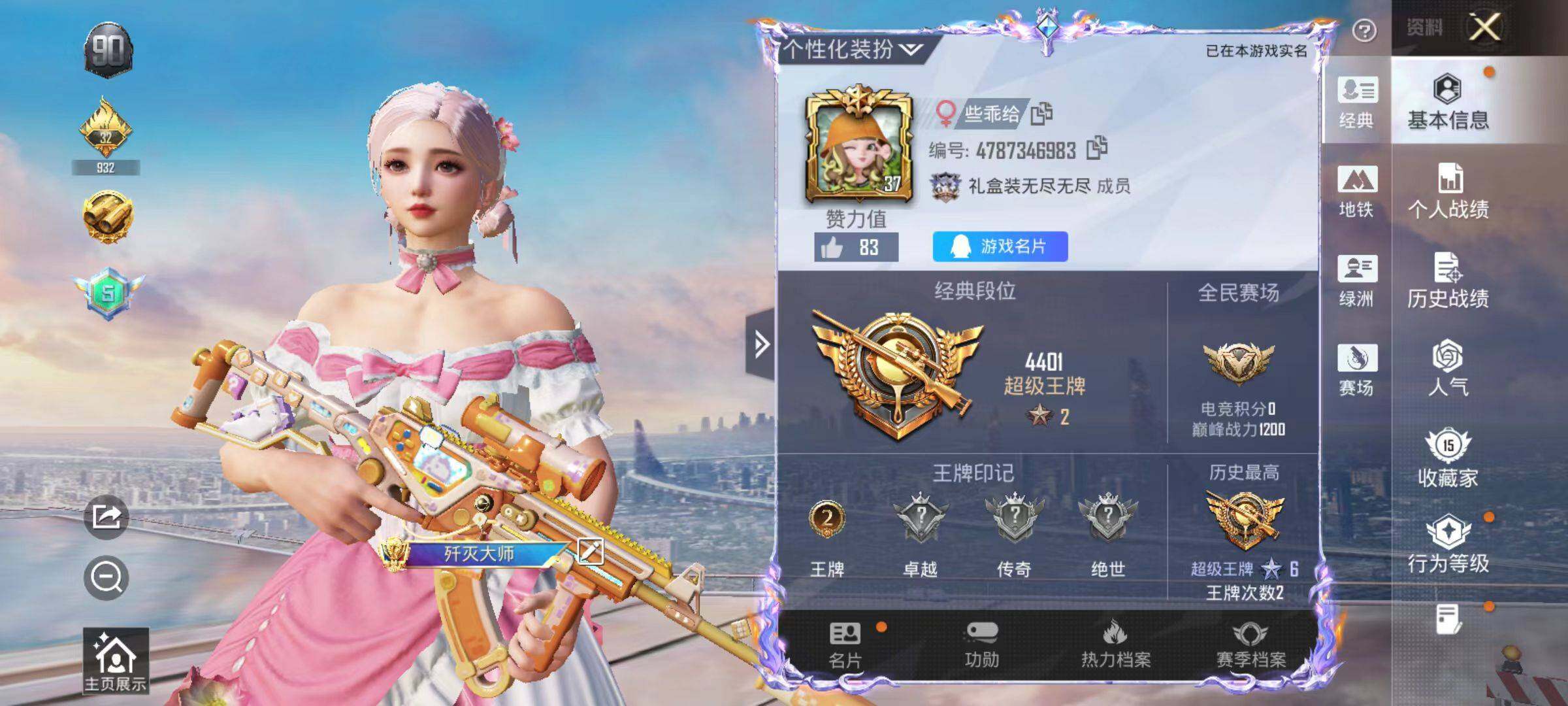 粉枪3/套装17/枪皮28/热力值6890/历史最高段位:王牌印记2次/Lv: