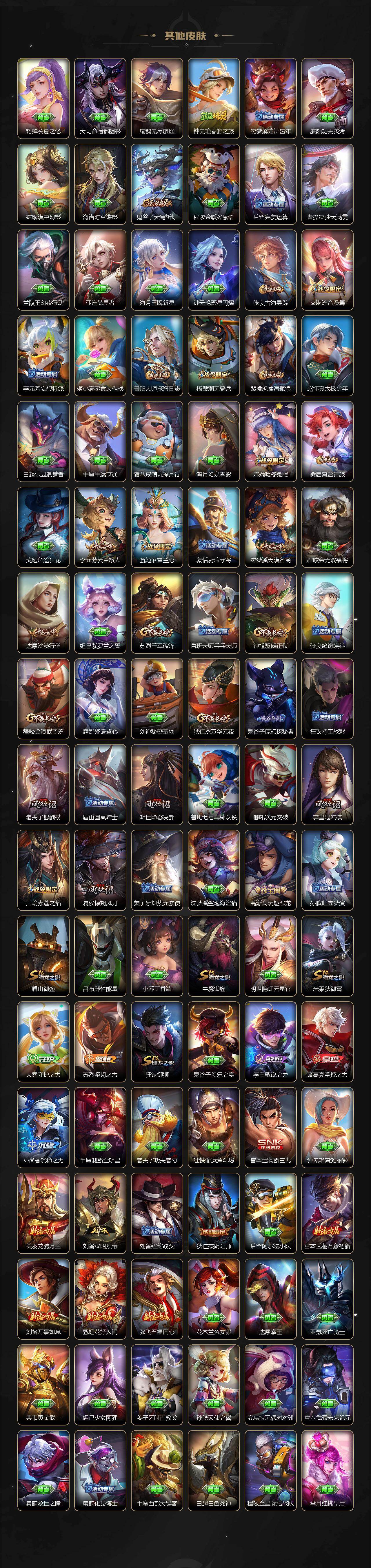 【传说皮肤】:后羿神树通天,桑启鸣野蒿,上官婉儿妄想奇谈,花木兰燃星之曲,孙悟空齐天大圣,曜山海苍雷引,李白诗剑行,小乔音你心动,虞姬云霓雀翎,达摩黄金狮子座,花木兰冠军飞将