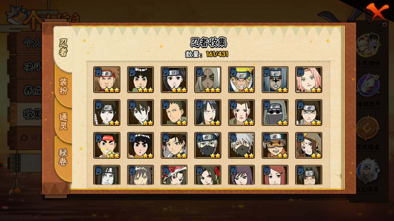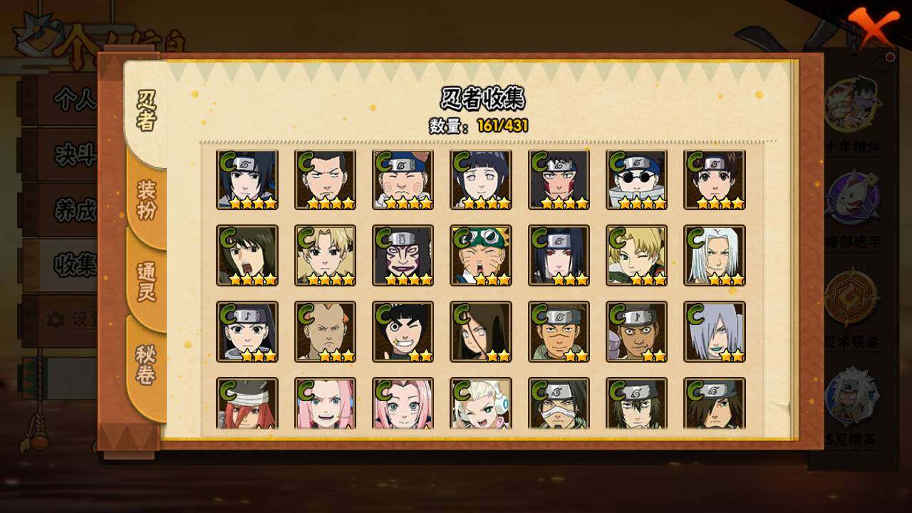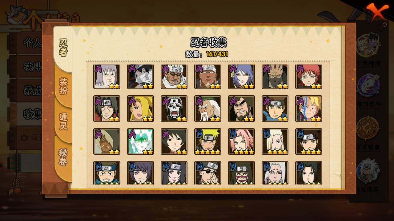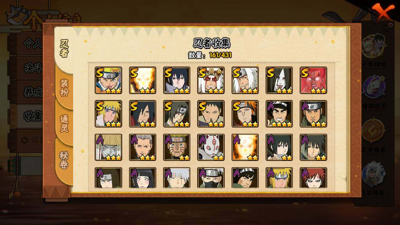 【S级忍者】:宇智波斑「秽土转生·解」(3星),宇智波带土「忍界大战」(3星),宇智波鼬「须佐能乎」(3星),自来也「舞之豪杰」(3星),大蛇丸(3星),自来也「传说中的三忍」(3星),波风水门(3星),漩涡鸣人「九喇嘛连结」(3星),迈特凯「死门」(3星),佩恩「天道」(3星),宇智波佐助「永恒万花筒」(3星),漩涡鸣人·宇智波佐