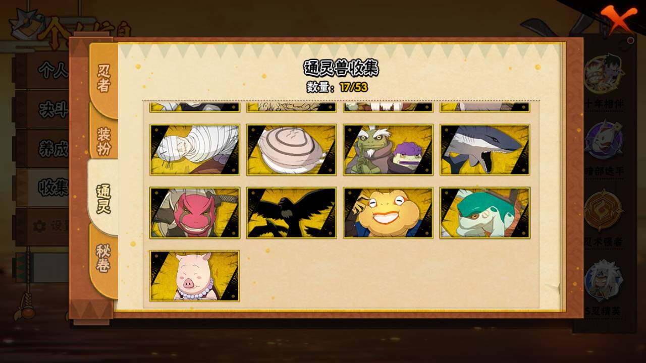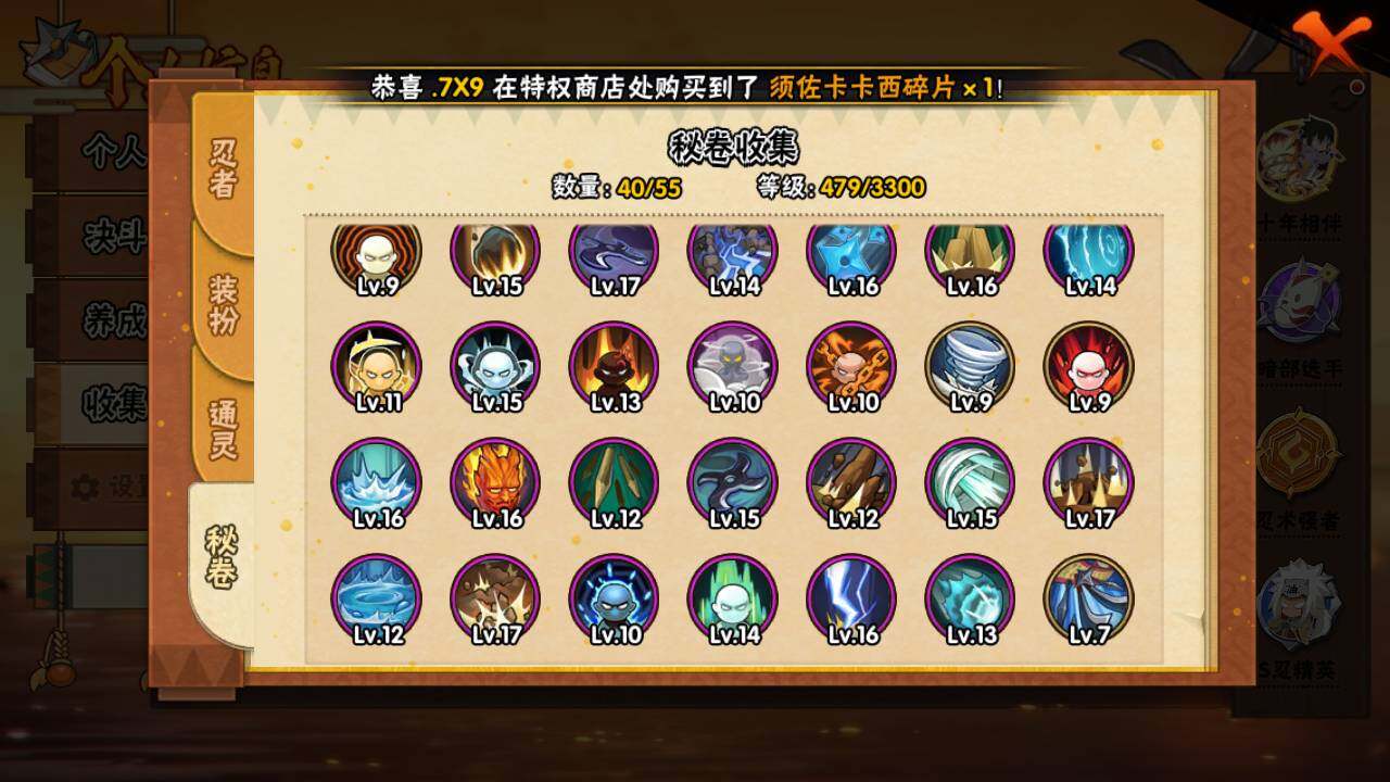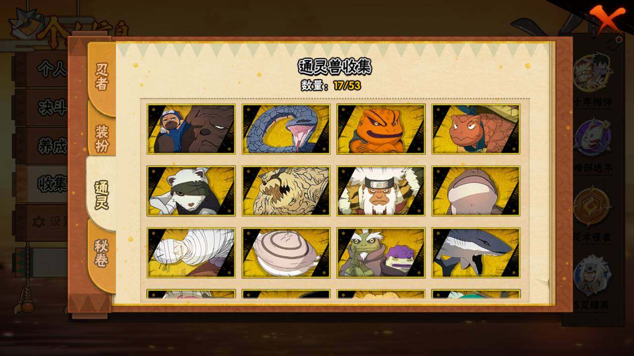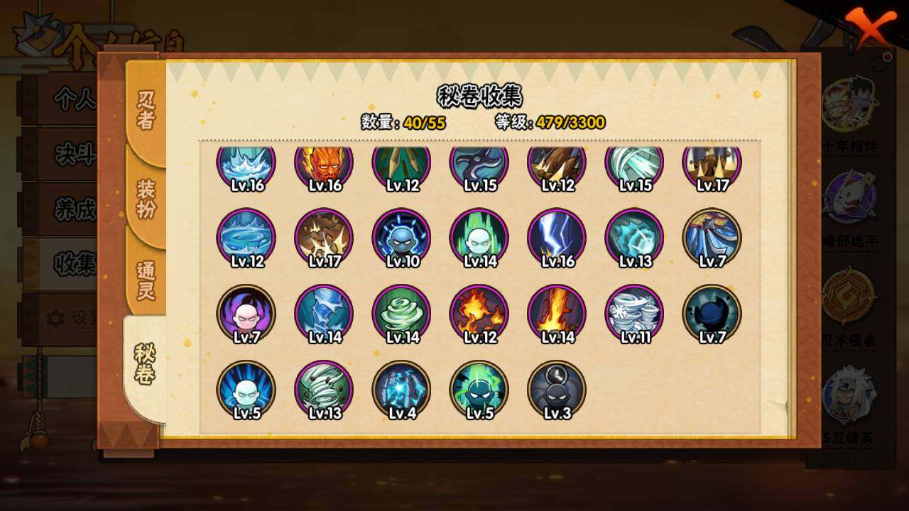 【S级忍者】:宇智波斑「秽土转生·解」(3星),宇智波带土「忍界大战」(3星),宇智波鼬「须佐能乎」(3星),自来也「舞之豪杰」(3星),大蛇丸(3星),自来也「传说中的三忍」(3星),波风水门(3星),漩涡鸣人「九喇嘛连结」(3星),迈特凯「死门」(3星),佩恩「天道」(3星),宇智波佐助「永恒万花筒」(3星),漩涡鸣人·宇智波佐