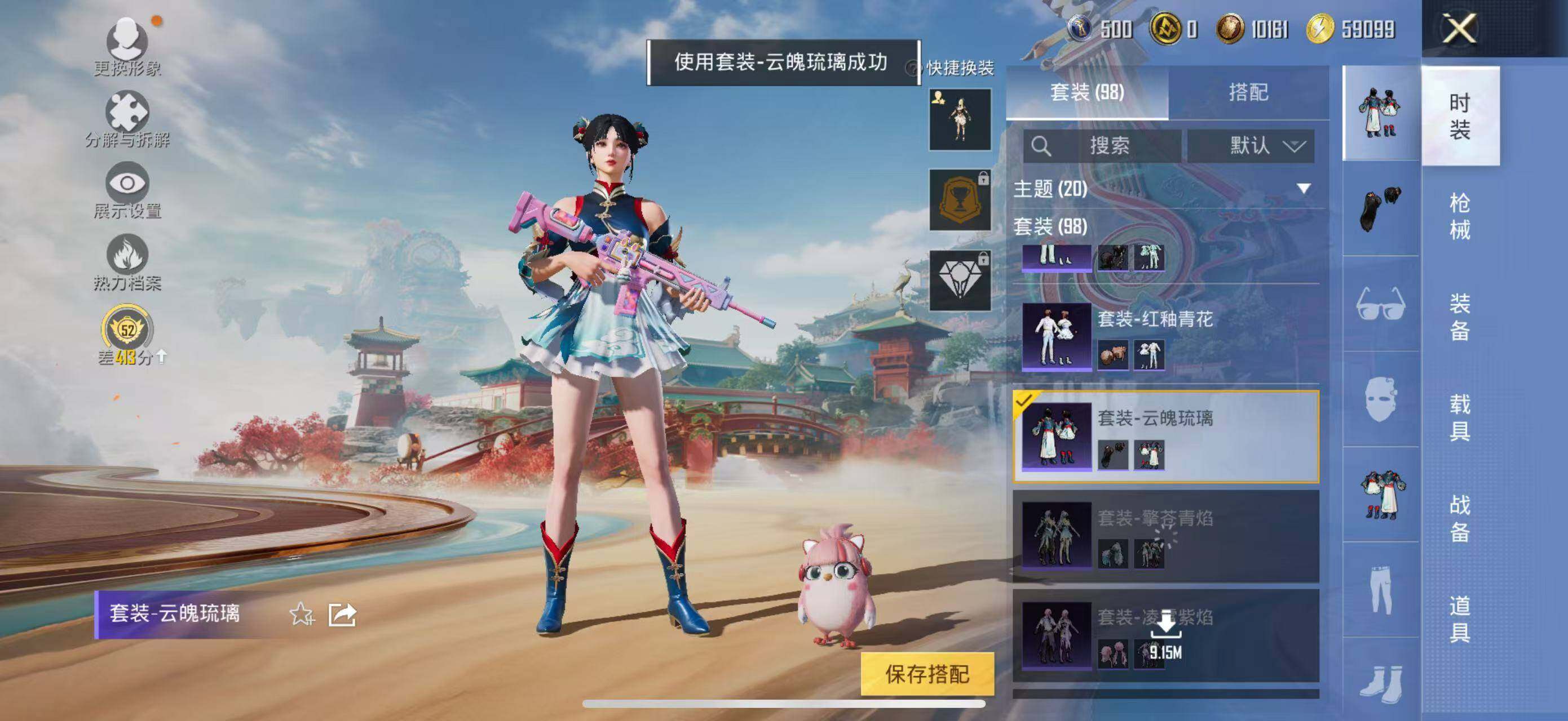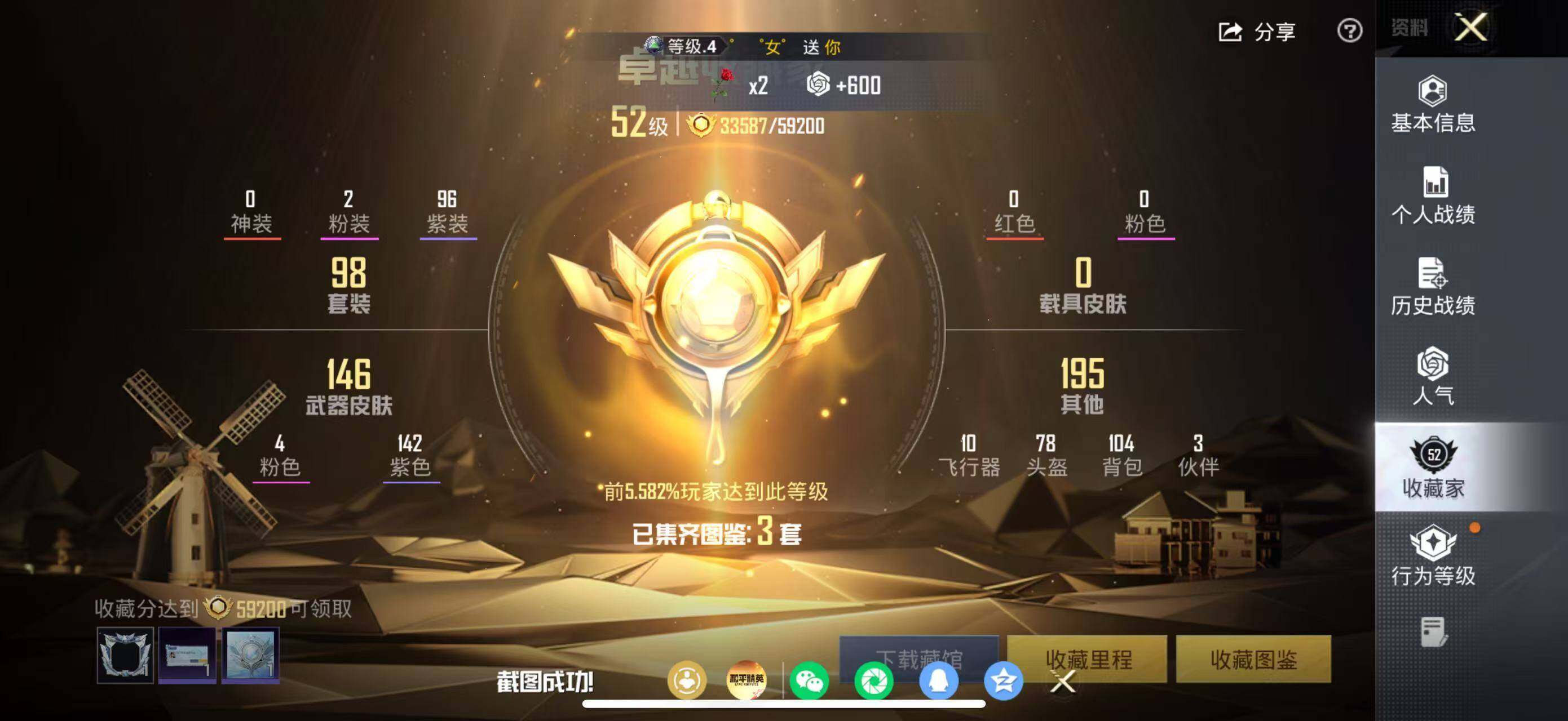 粉装2/粉枪4/珍稀飞行器130245,72307,100681,129297/套装98/枪皮164/热力值43229/历史最高段位:王牌印记8次/Lv:56/五级M416-电玩时刻/五级Kar98K-巳巳如意/五级Mk14-福马献瑞/五级DP-28-豹影疾电/套装-龟仙人/暗夜玫瑰/创世·救赎/M416-电玩时刻/Kar98K-巳巳如意/Mk14-福马献瑞/DP-28-豹影疾电/炫彩糖果飞行器