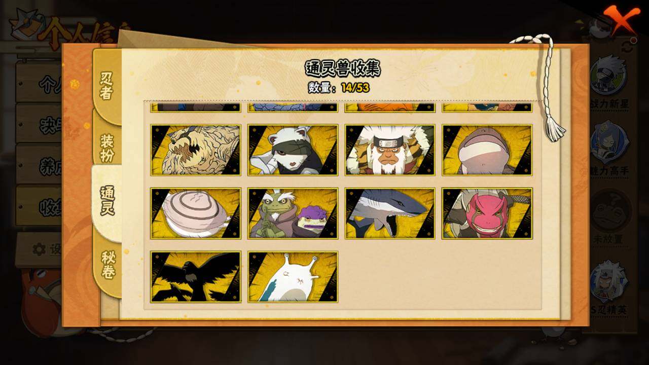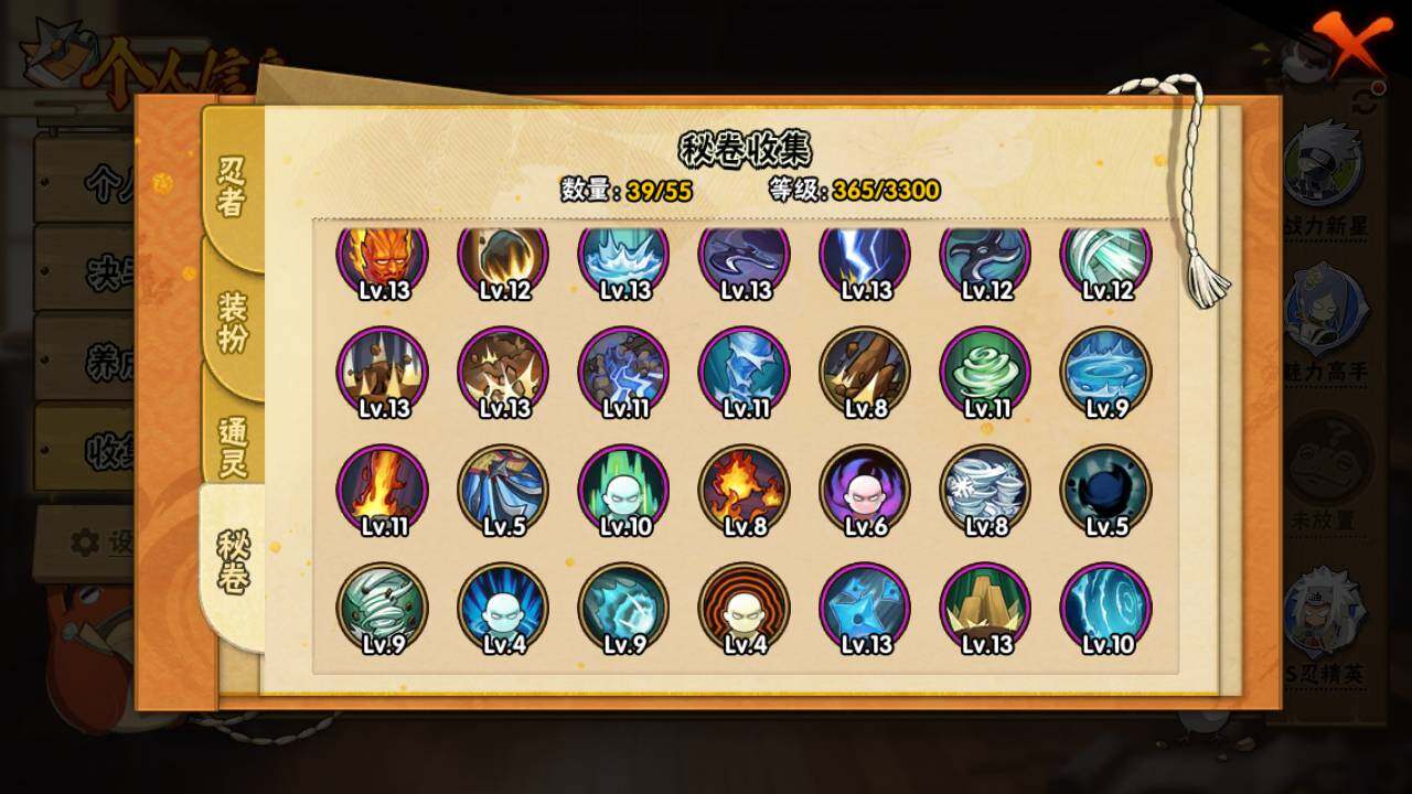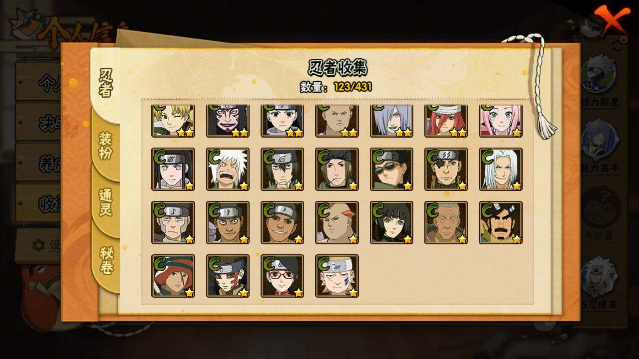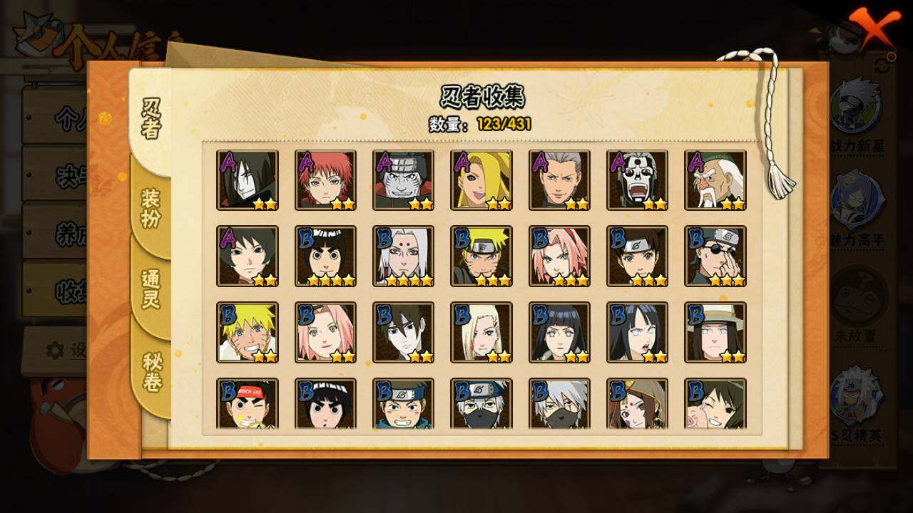 【S级忍者】:长门「秽土转生」(3星),千手柱间「秽土转生」(3星),宇智波带土「忍界大战」(3星),宇智波鼬「须佐能乎」(3星),宇智波斑「木叶创立」(3星),自来也「舞之豪杰」(3星),大蛇丸(3星),波风水门(3星),迈特凯「死门」(3星),佩恩「天道」(3星),宇智波斑 「白面具」(3星宇智波斑「白面具」)