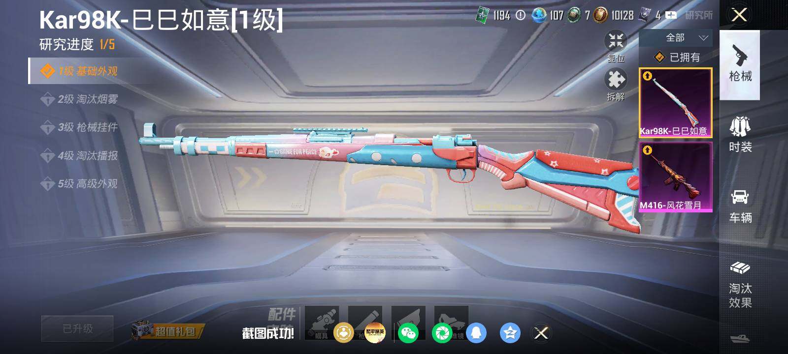 【粉色枪皮等级】:M416-风花雪月(六级),Kar98K-巳巳如意(