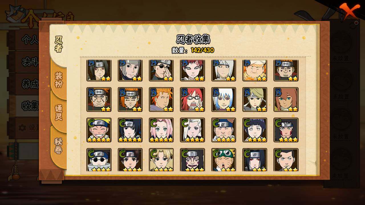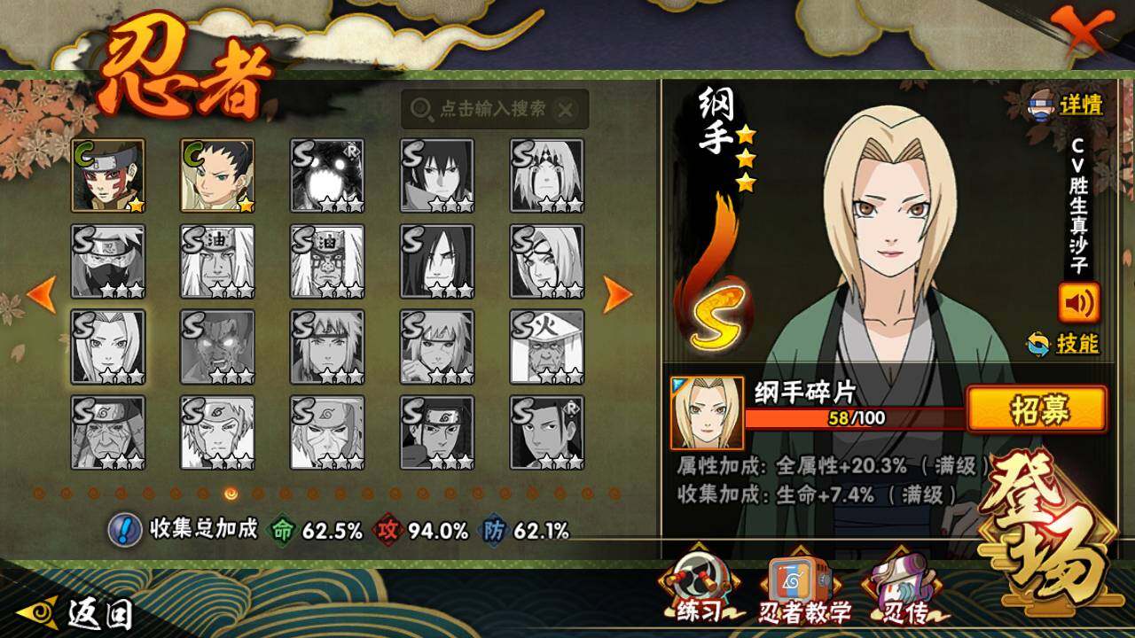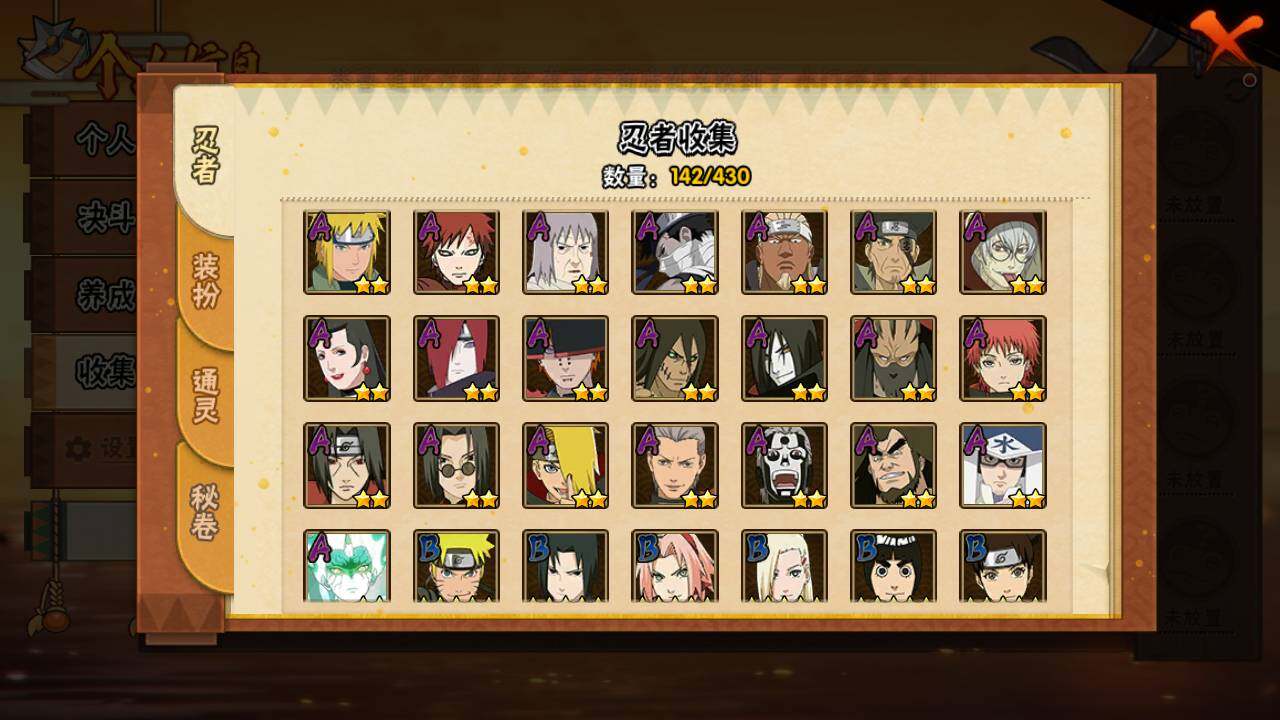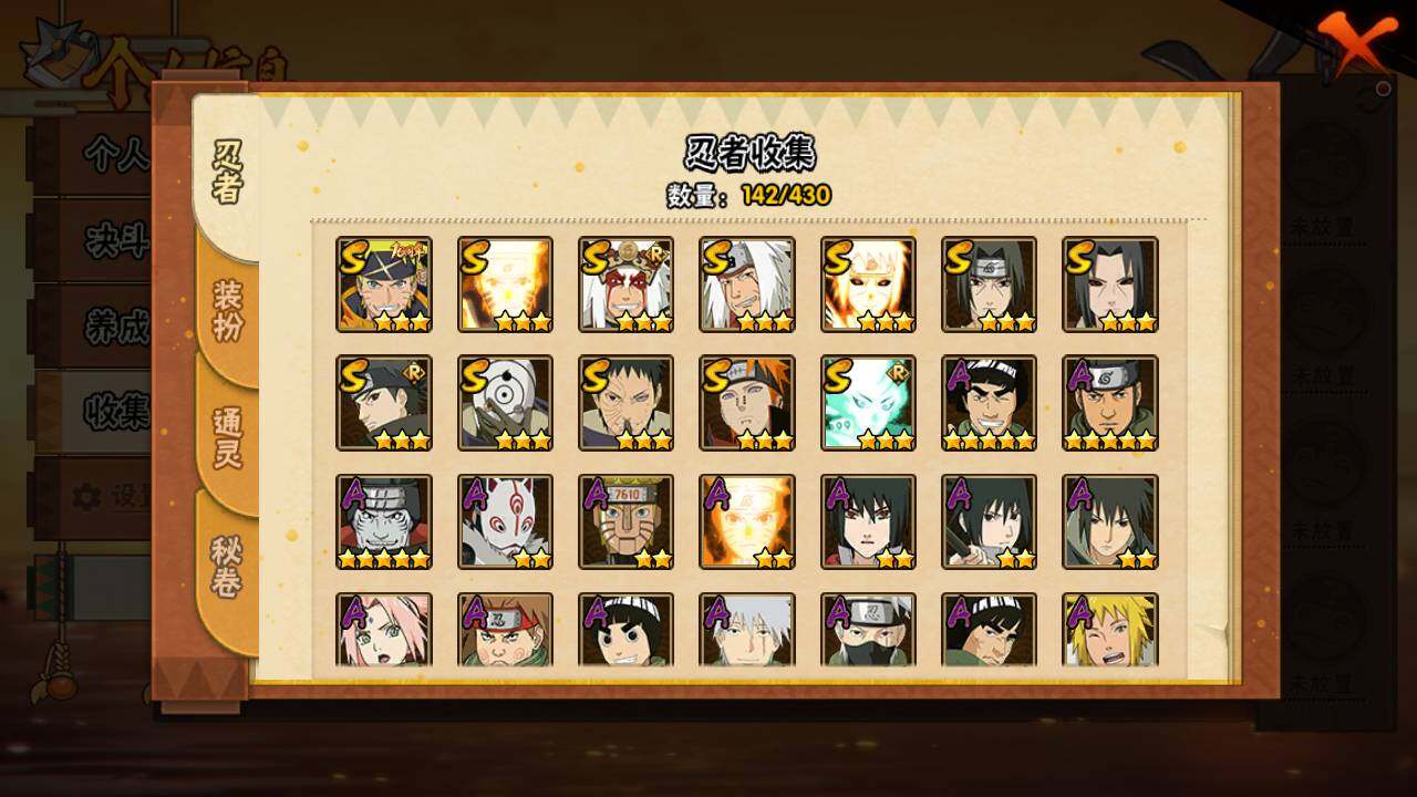 【S级忍者】:宇智波鼬「秽土转生」(3星),宇智波带土「忍界大战」(3星),宇智波鼬「须佐能乎」(3星),宇智波止水「须佐能乎」(3星),自来也「舞之豪杰」(3星),自来也「传说中的三忍」(3星),漩涡鸣人「九喇嘛连结」(3星),佩恩「天道」(3星),宇智波斑 「白面具」(3星宇智波斑「白面具」),大筒木舍人「