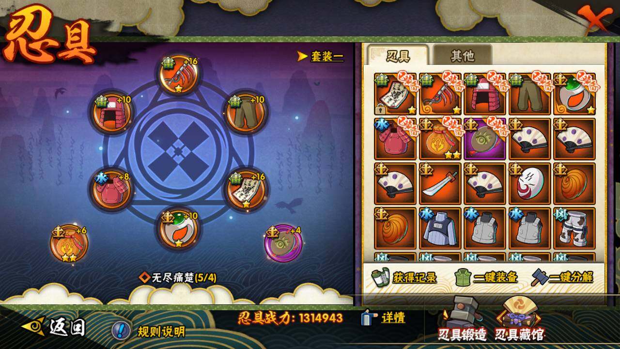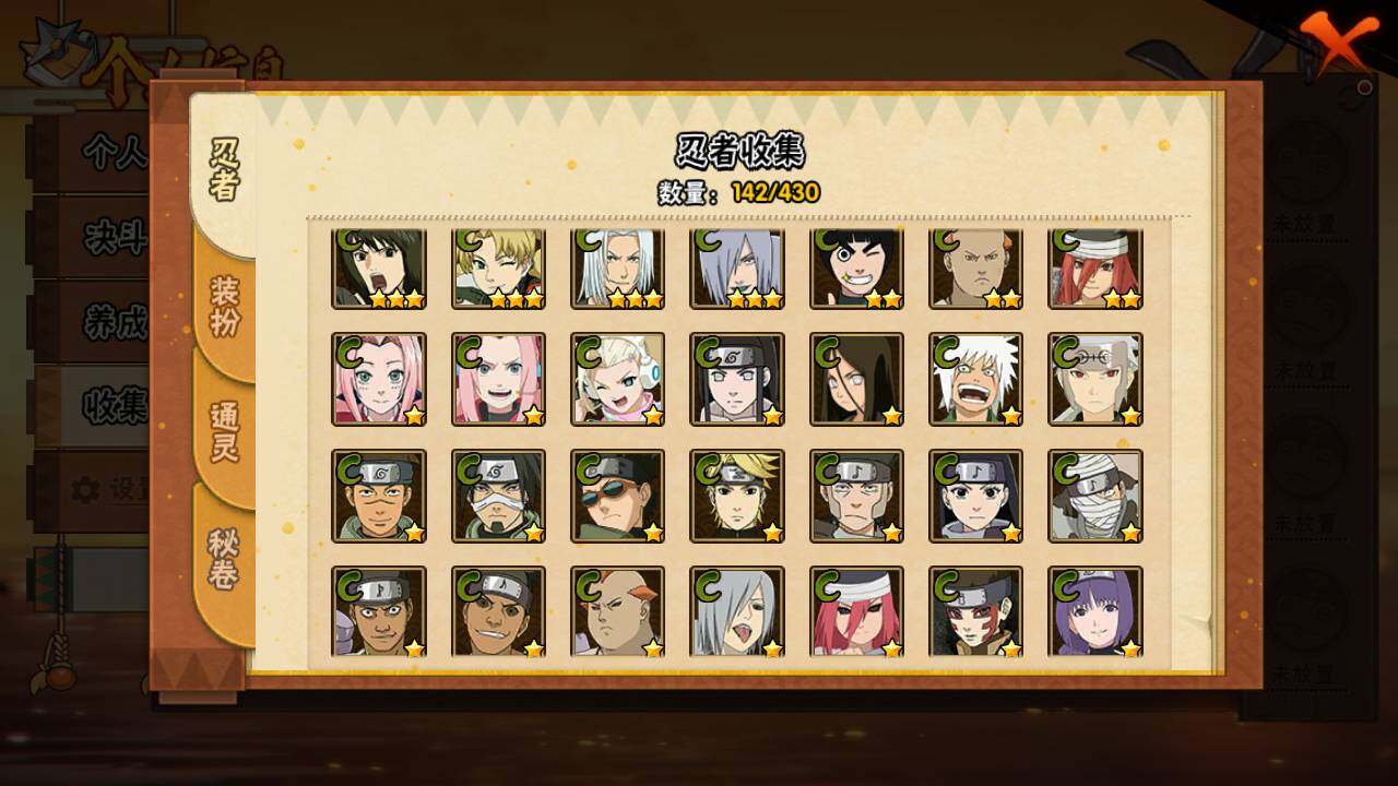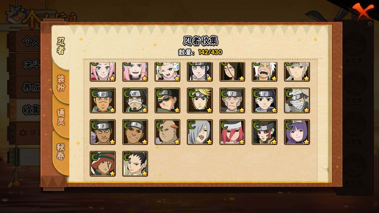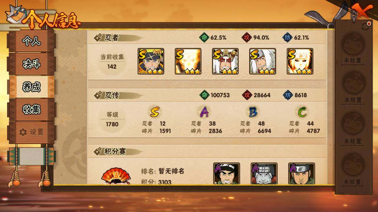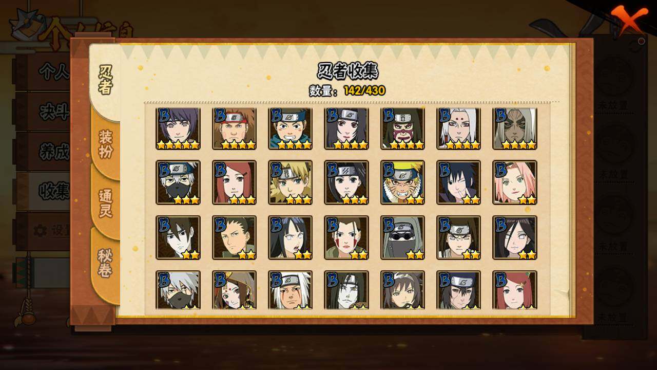 【S级忍者】:宇智波鼬「秽土转生」(3星),宇智波带土「忍界大战」(3星),宇智波鼬「须佐能乎」(3星),宇智波止水「须佐能乎」(3星),自来也「舞之豪杰」(3星),自来也「传说中的三忍」(3星),漩涡鸣人「九喇嘛连结」(3星),佩恩「天道」(3星),宇智波斑 「白面具」(3星宇智波斑「白面具」),大筒木舍人「
