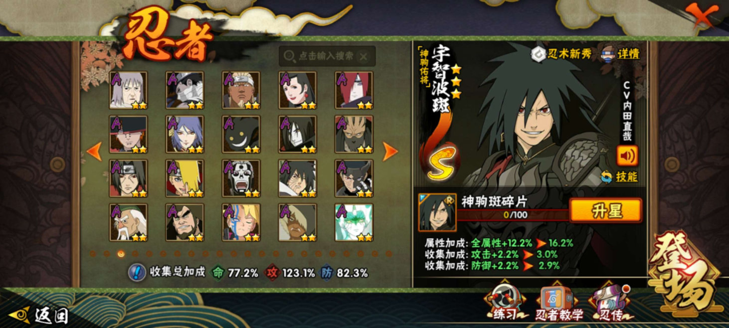 【S级忍者】宇智波带土「忍界大战」(3星),宇智波斑「木叶创立」(3星),旗木卡卡西「须佐能乎」(3星),漩涡鸣人「暴怒·第六尾」(3星),宇智波斑「秽土转生·解」(3星),宇智波佐助「永恒万花筒」(3星),宇智波止水「须佐能乎」(3星),漩涡鸣人「九喇嘛连结」(3星),波风水门「九喇嘛连结」(3星),宇智波斑「神驹佑将」(