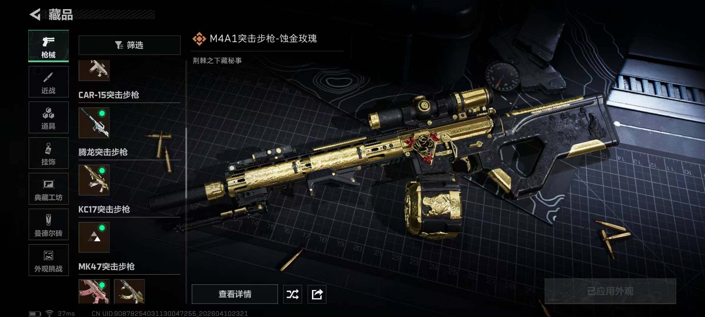 【传说外观】:M4A1突击步枪-蚀金玫瑰,M16A4突击步枪-狩猎时刻,AUG突击步枪-悠然茶歇,SCAR-H战斗步枪-启航,G3战斗步枪-狩猎时刻,CAR-15突击步枪-阿米娅,腾龙突击步枪-万金泪冠,KC17突击步枪-电锯惊魂,MK47突