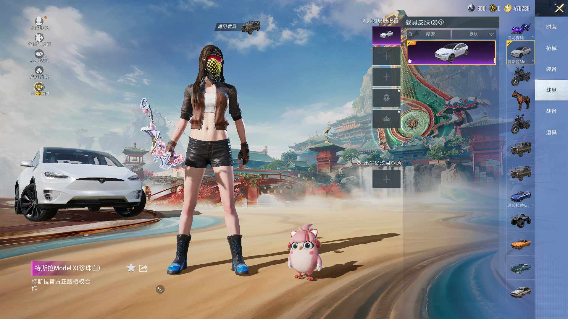 【粉色载具】:特斯拉Model X(珍珠白),玛莎拉蒂Ghibli(蓝),海龙奔腾