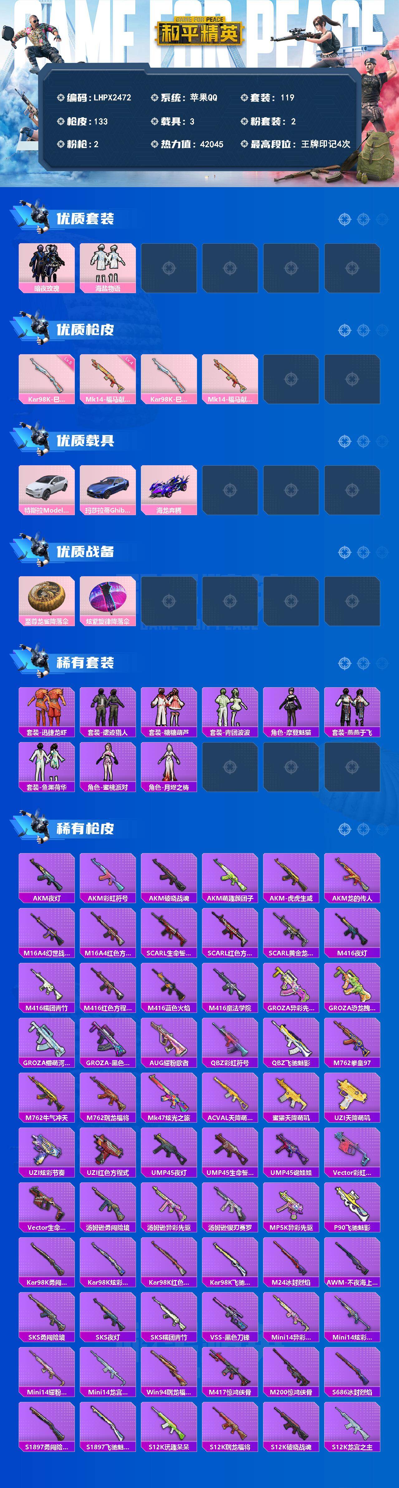 【特价出售/店主推荐】苹果 手Q-2粉装-2特效枪-3载具-0粉色飞行器-42045热力值-4王牌印记-119套装-133枪皮