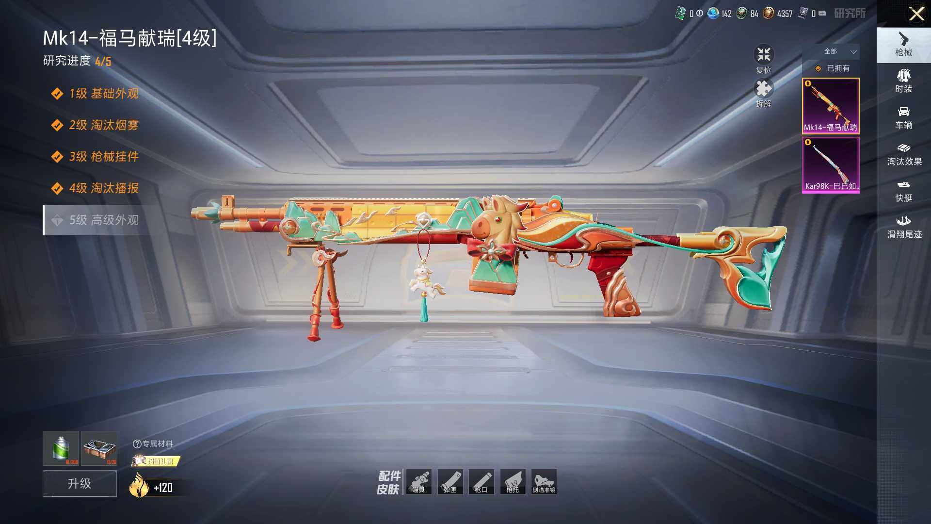 【粉色枪皮等级】:Kar98K-巳巳如意(五级),Mk14-福马献瑞(四级)