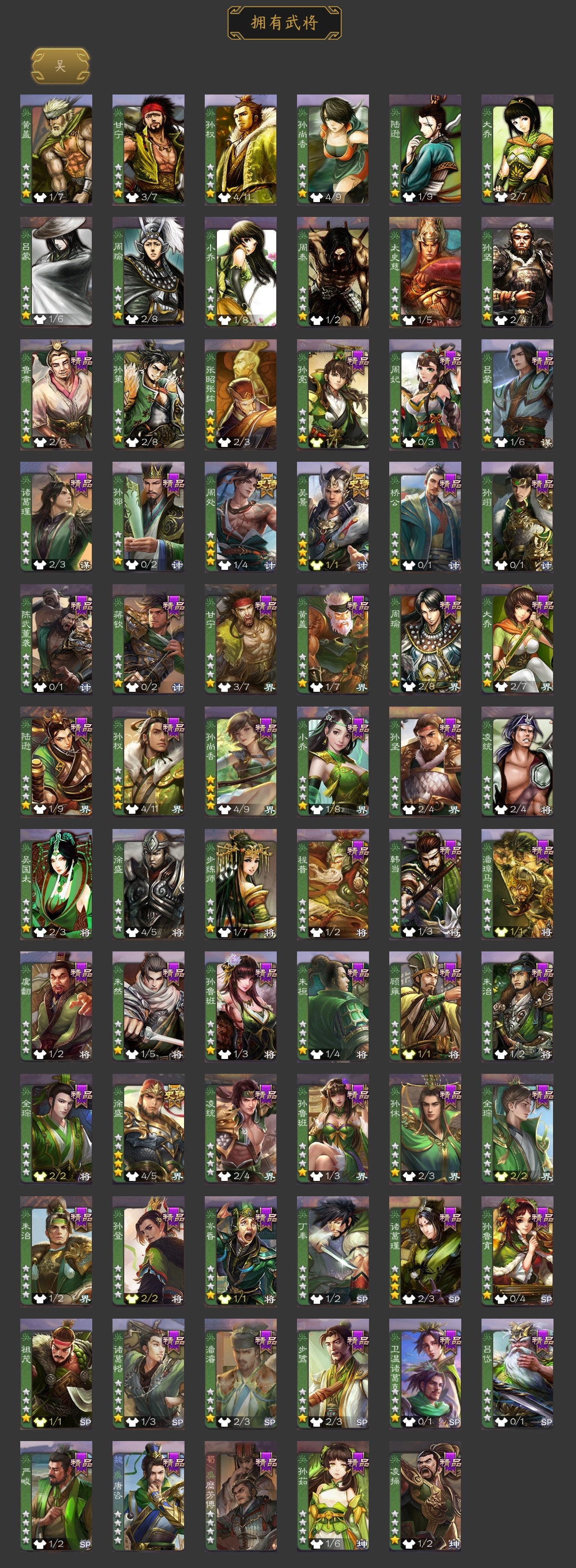 VIP等级: VIP9 官阶: 骠骑将军 武将数量: 303 动态皮肤数量: 22 神将: 神郭嘉,神吕布,神赵云,神吕蒙,神周瑜 魏国武将: 戏志才,曹纯,程昱,郝昭,界曹真,界钟会,唐咨-魏,张辽,SP蔡文姬,SP曹仁,SP关羽,SP贾诩,SP姜维,SP庞德,卞夫人,曹昂,曹操,曹冲,曹洪,曹丕,曹仁,曹叡,王异,张恭,鲁芝,界满宠,曹休,界曹植,满宠,荀攸,王基,钟繇,郭嘉,荀彧,阮慧,杜
