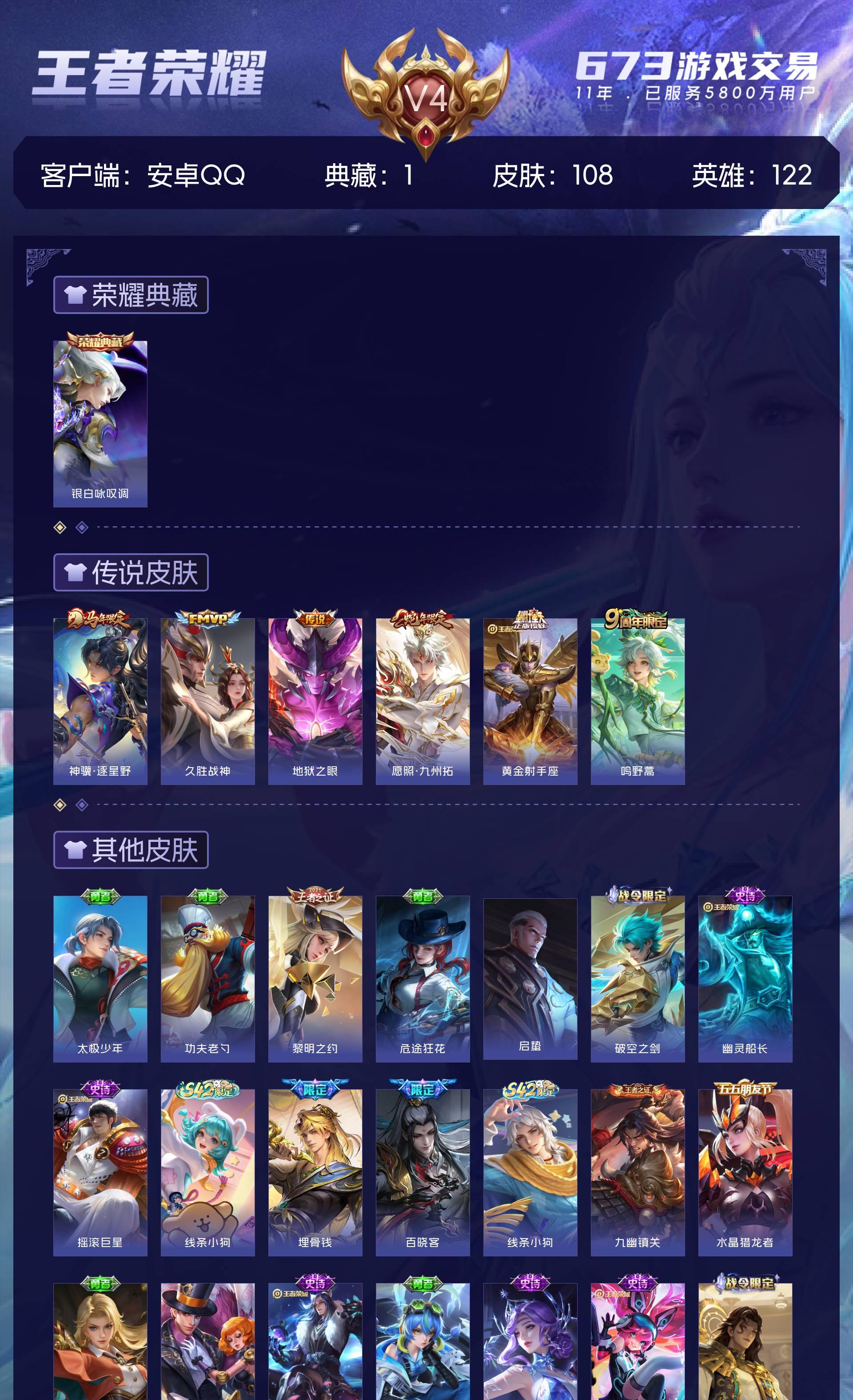 V4 皮肤108 英雄122 最强王者 荣耀典藏1 传说6