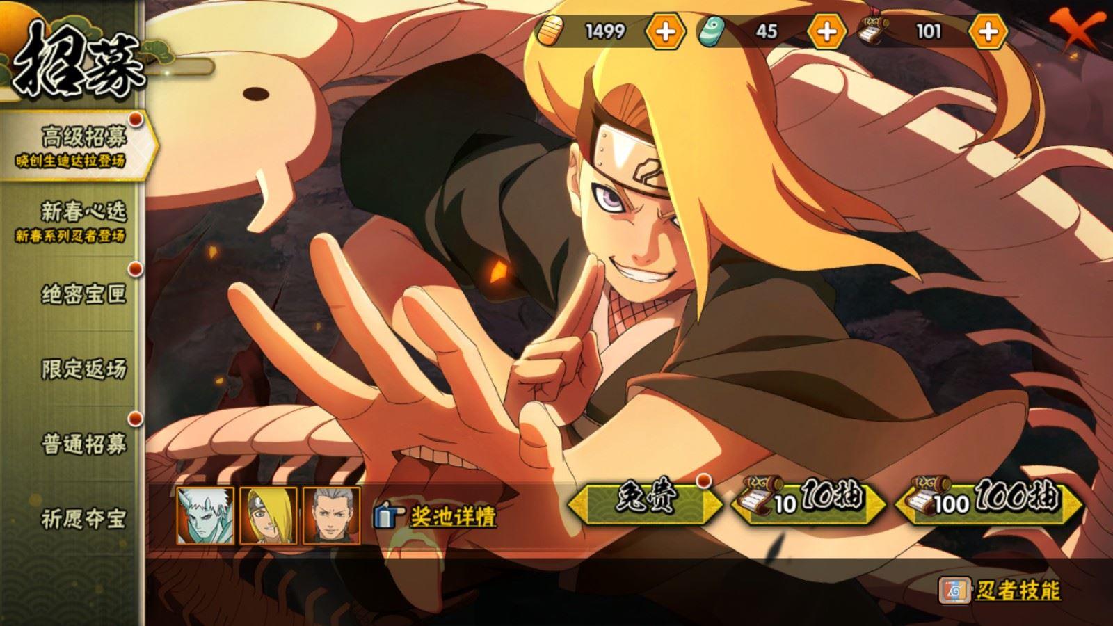 【A忍者】小南「神驹佑将」,旗木卡卡西「神威对决」,机械鸣人「初始形态」,纲手「妖怪奇谭」,巳月「仙人模式」,迈特凯「青春爆炸」,长十郎「六代目水影」,宇智