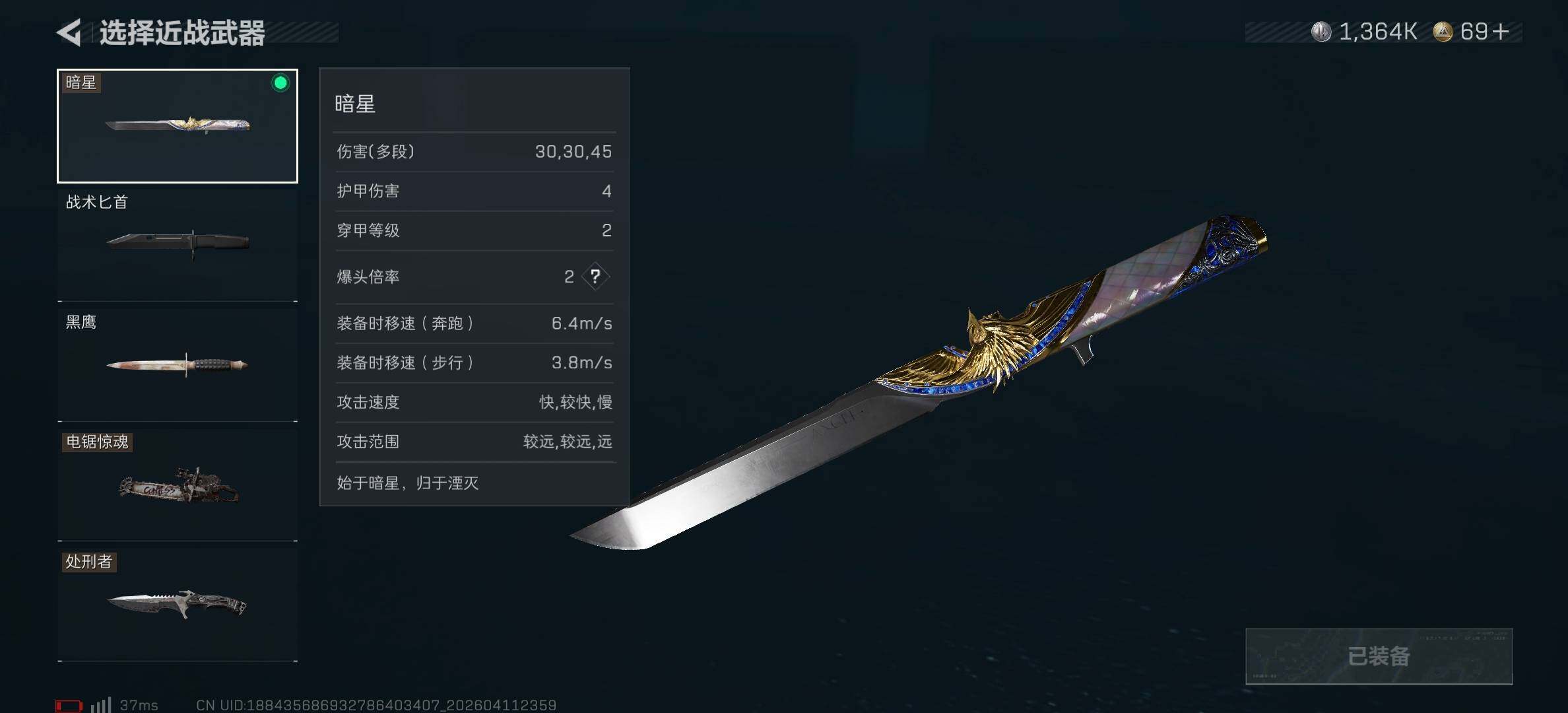 【近战皮肤】:近战-暗星,近战-电锯惊魂,近战-处刑者2级,近战-黑鹰