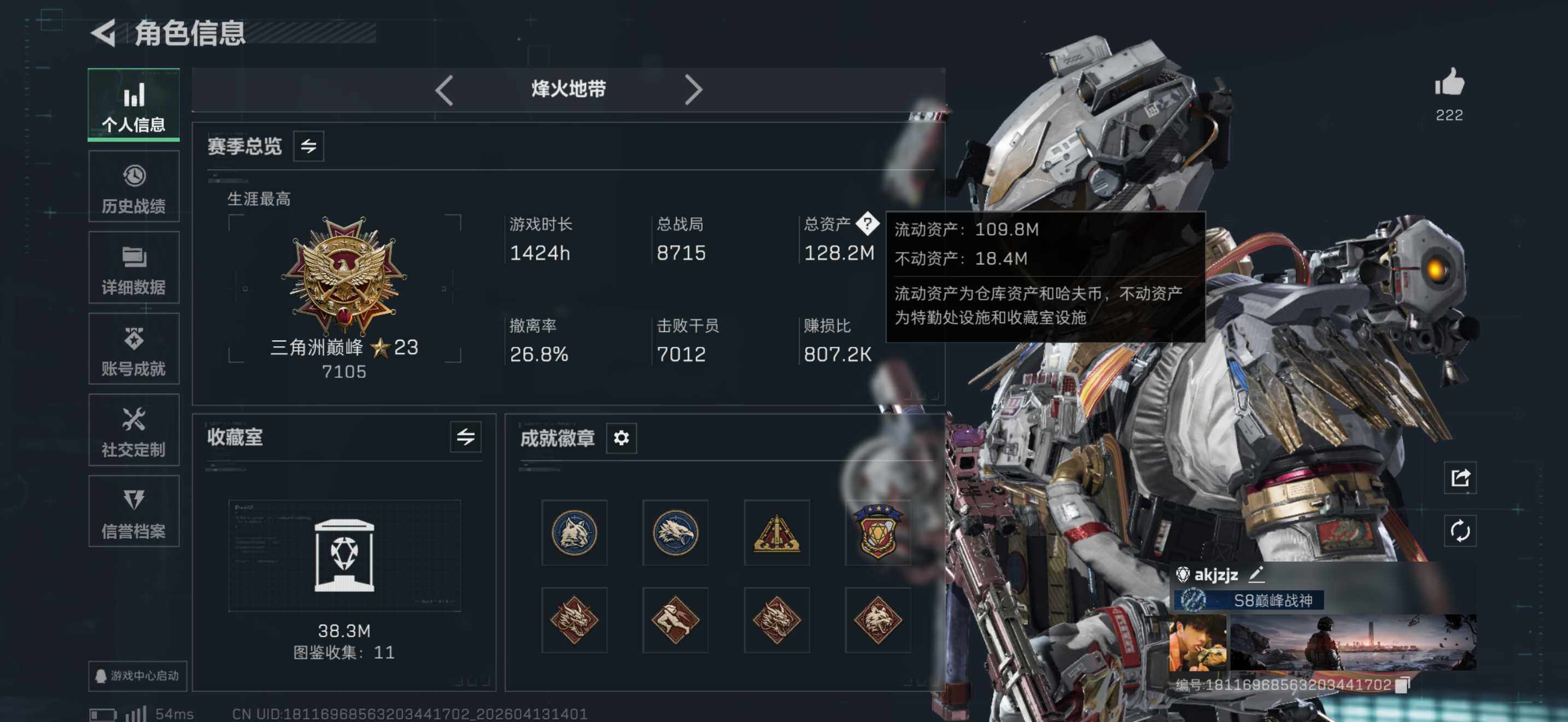 130m总资产-1121k哈夫币-60烽火等级-三角洲巅峰-31战场等级-列兵