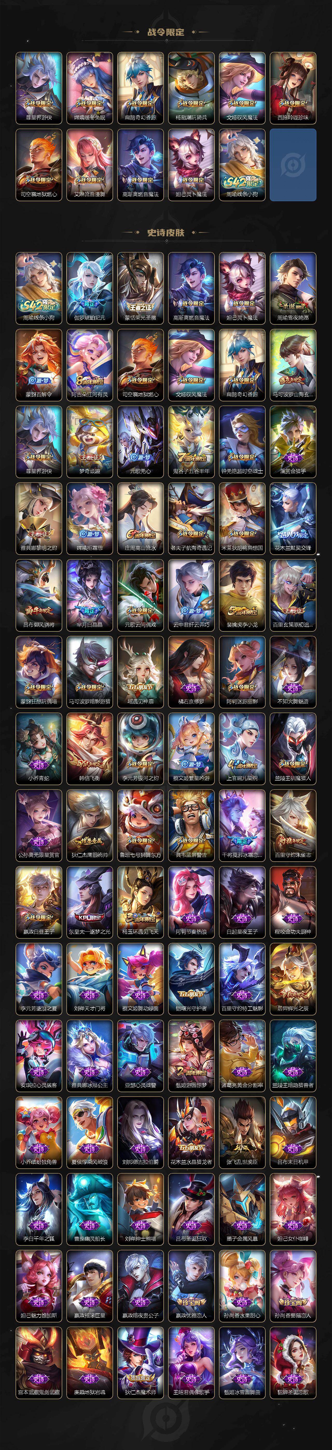 【限定皮肤】:姜子牙天穹之誓,狄仁杰阴阳师,赵云皇家上将,墨子神迹守卫,嬴政优雅恋人,嬴政白昼王子,孙尚香蔷薇恋人,鲁班七号狮舞东方,庄周