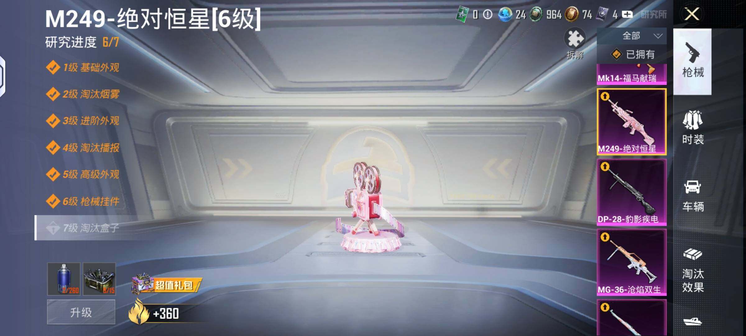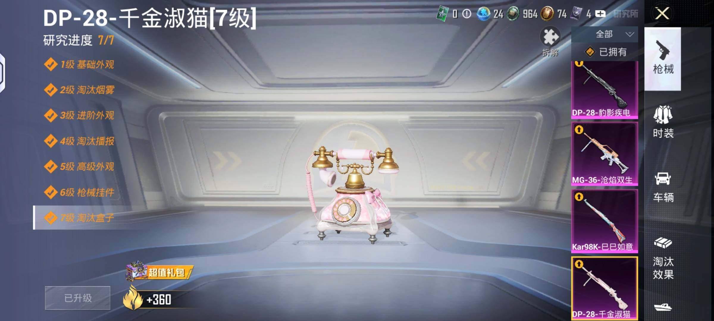 【粉色枪皮等级】:ACE32-萌骑漫游(二级),Kar98K-巳巳如意(五级),Mk14-福马献瑞(五级),M249-绝对恒星(六级),DP-28-千金淑猫(七级),DP-28-豹影疾电(五