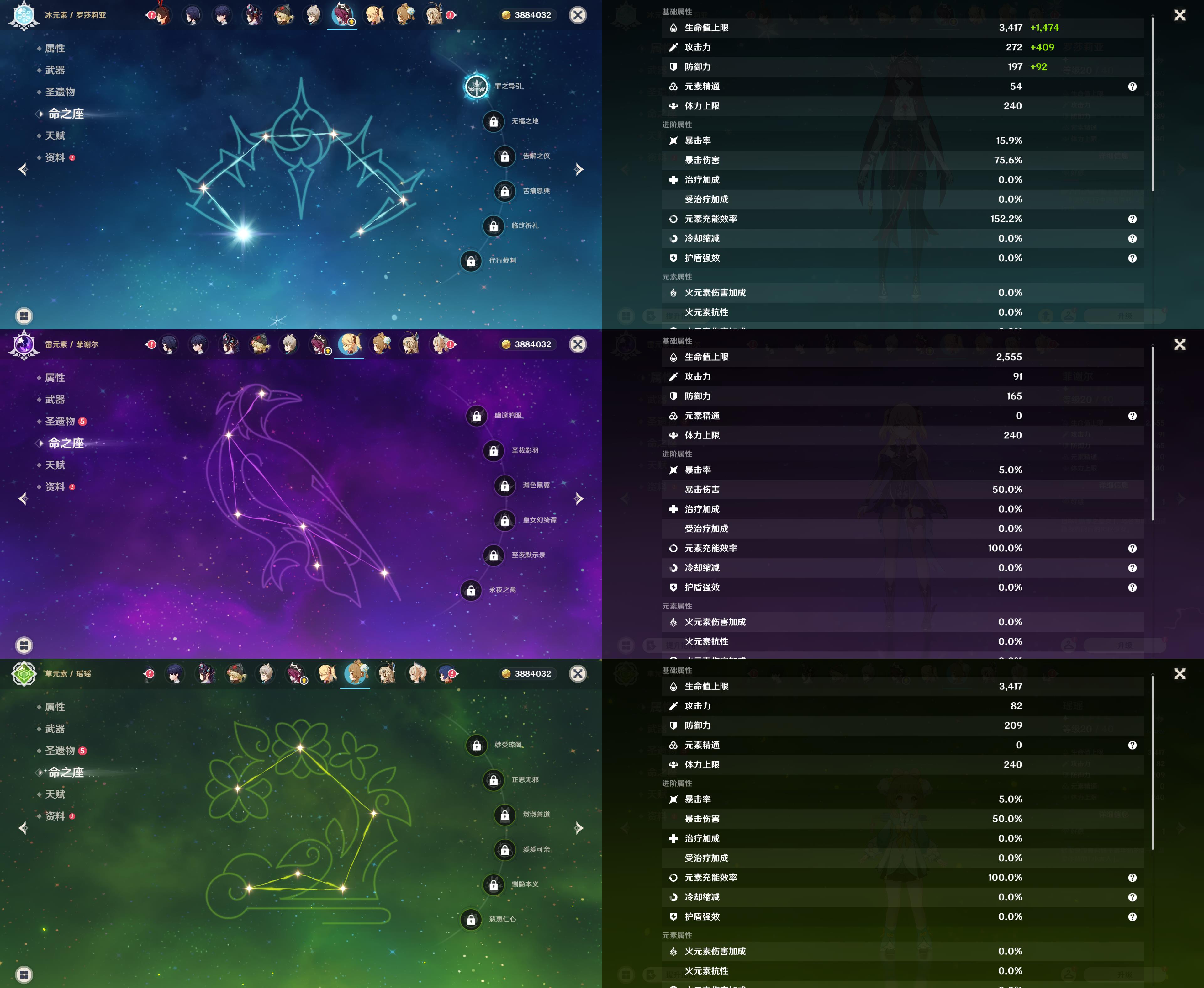 55级/12黄/女主/9个五星角色/1命兹白/1命哥伦比娅/阿蕾奇诺