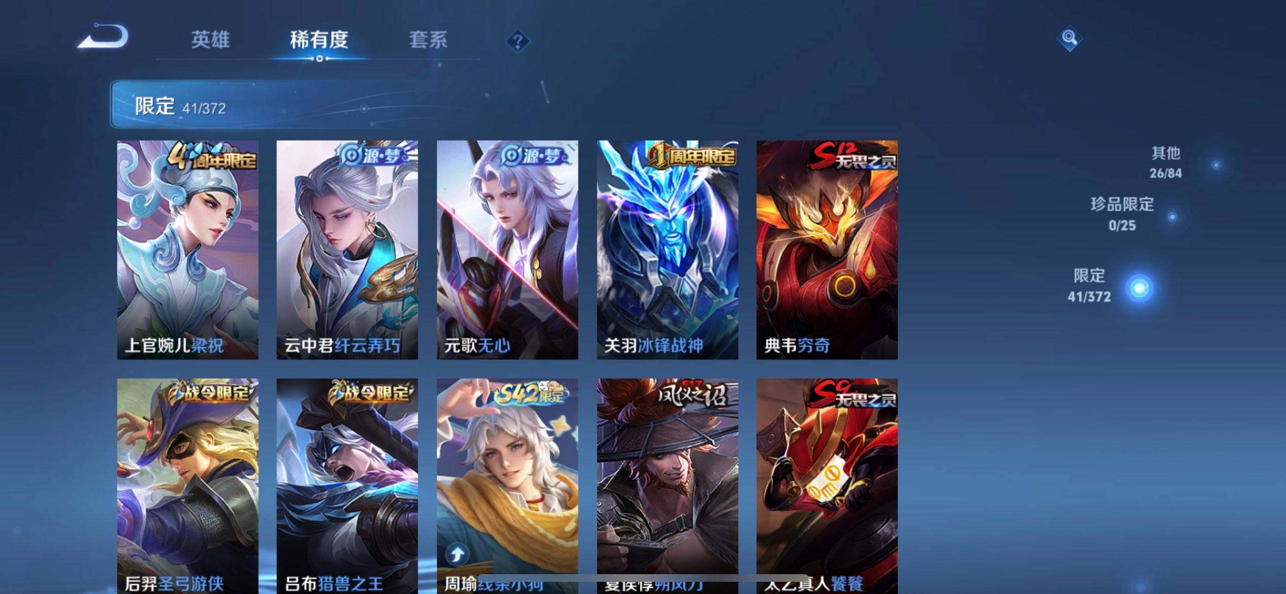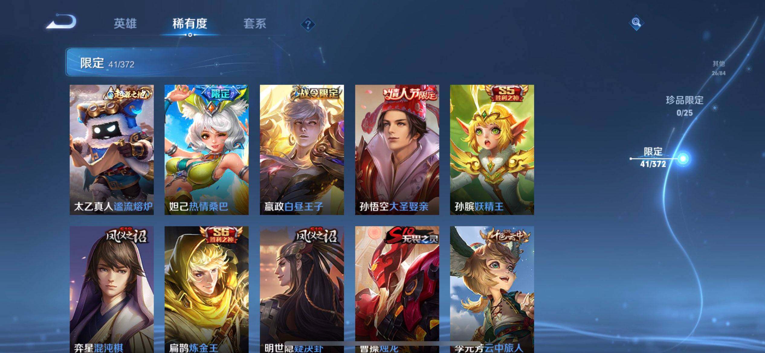 【限定皮肤】:白起狰,狄仁杰阴阳师,虞姬凯尔特女王,赵云皇家上将,妲己热情桑巴,嬴政白昼王子,孙膑妖精王,扁鹊炼金王,吕