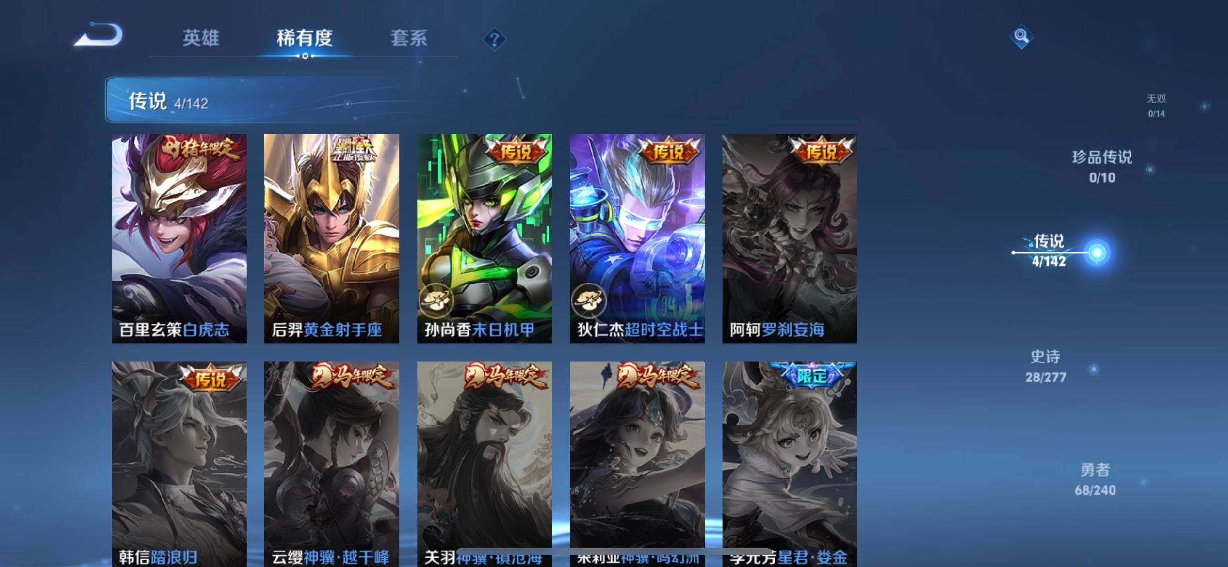 【传说皮肤】:百里玄策白虎志,后羿黄金射手座,孙尚香末日机甲,狄仁杰超时空战士