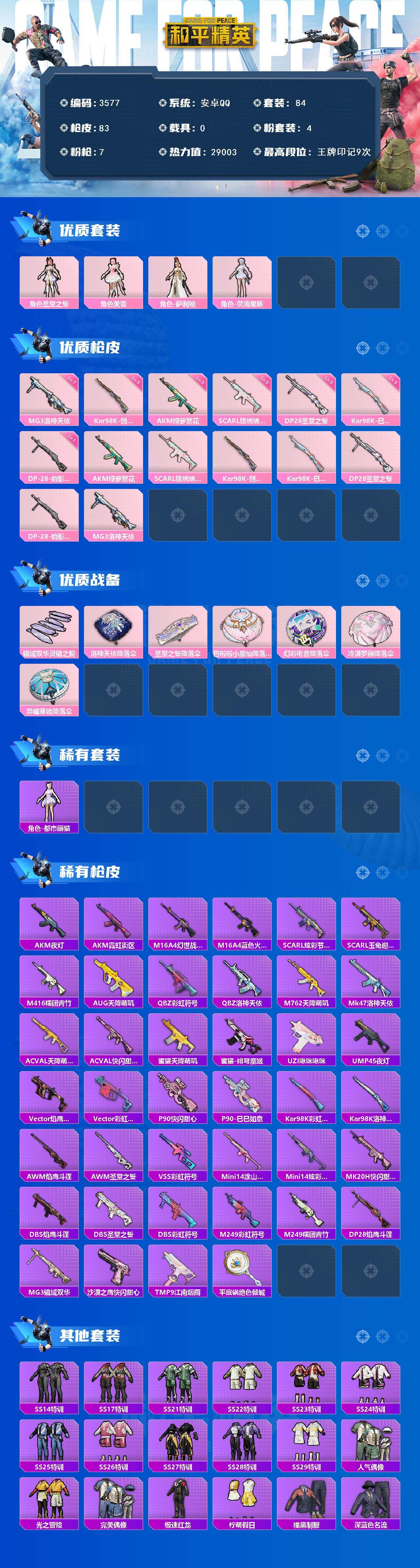 满级地铁 安卓 手Q-4粉装-7特效枪-0载具-1粉色飞行器-29003热力值-9王牌印记-84套装-83枪皮