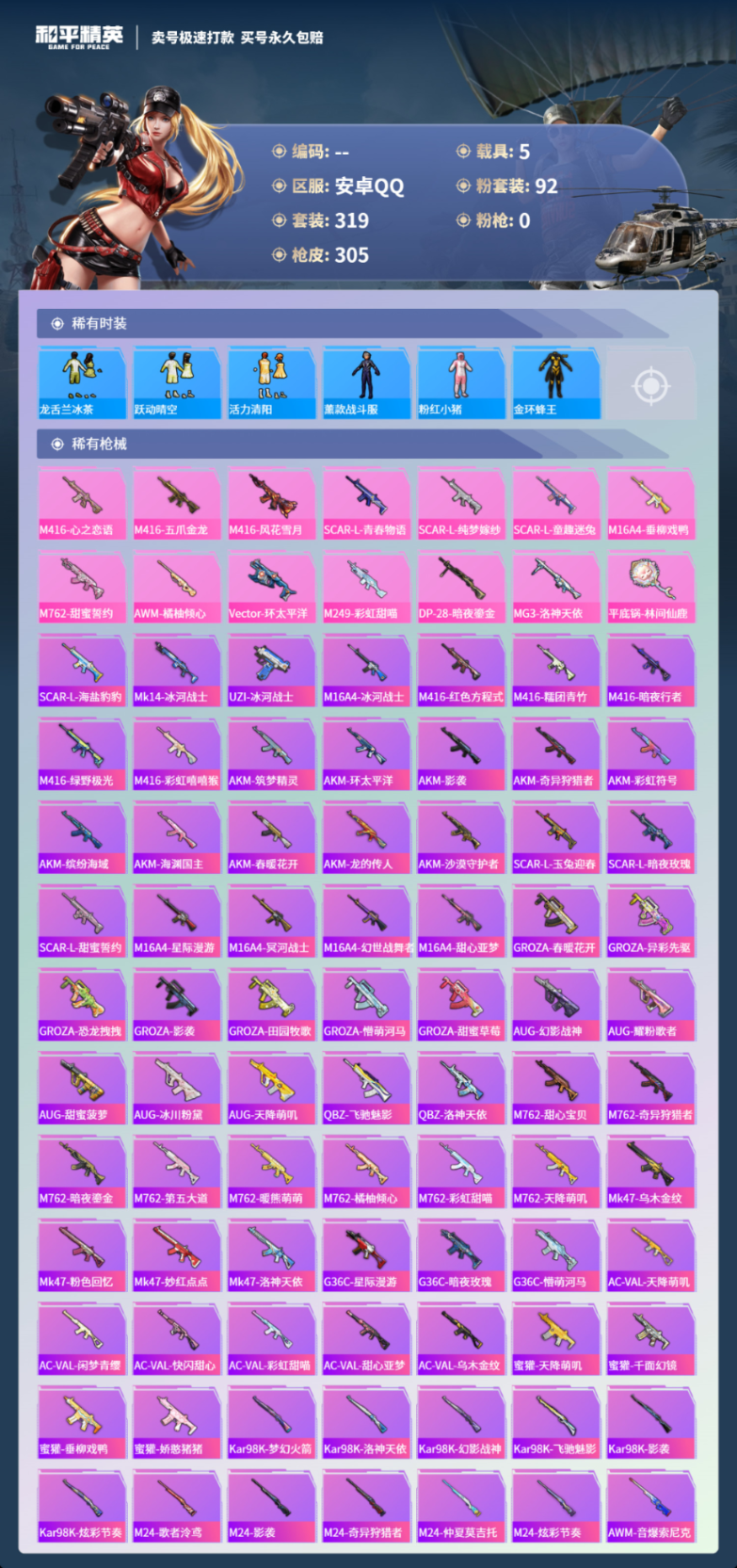 5载具-319套装-305枪皮-安卓 手Q-92粉装-37特效枪-5载具-热力值-12印记-319套装-305枪皮