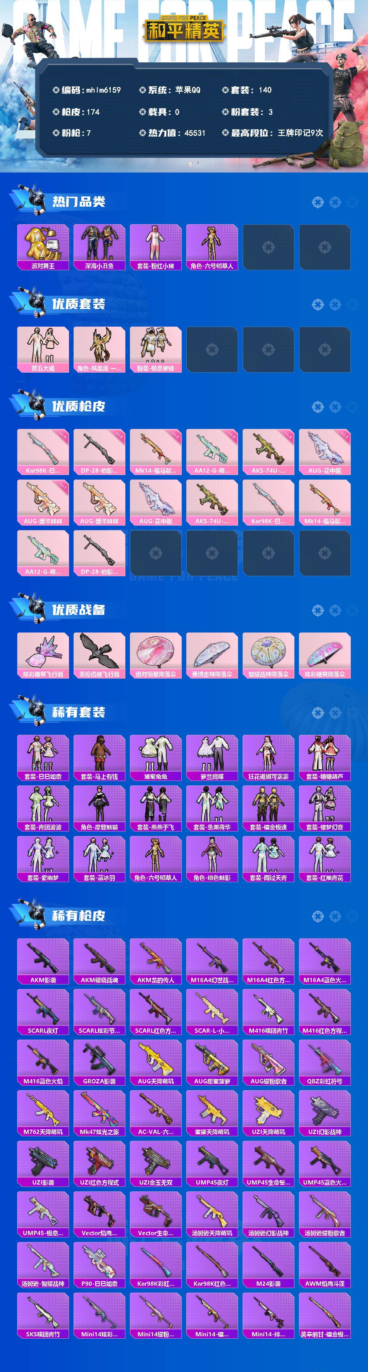 【mhlm6159】苹果 手Q-3粉装-7特效枪-0载具-2粉色飞行器-45531热力值-9王牌印记-140套装-174枪皮