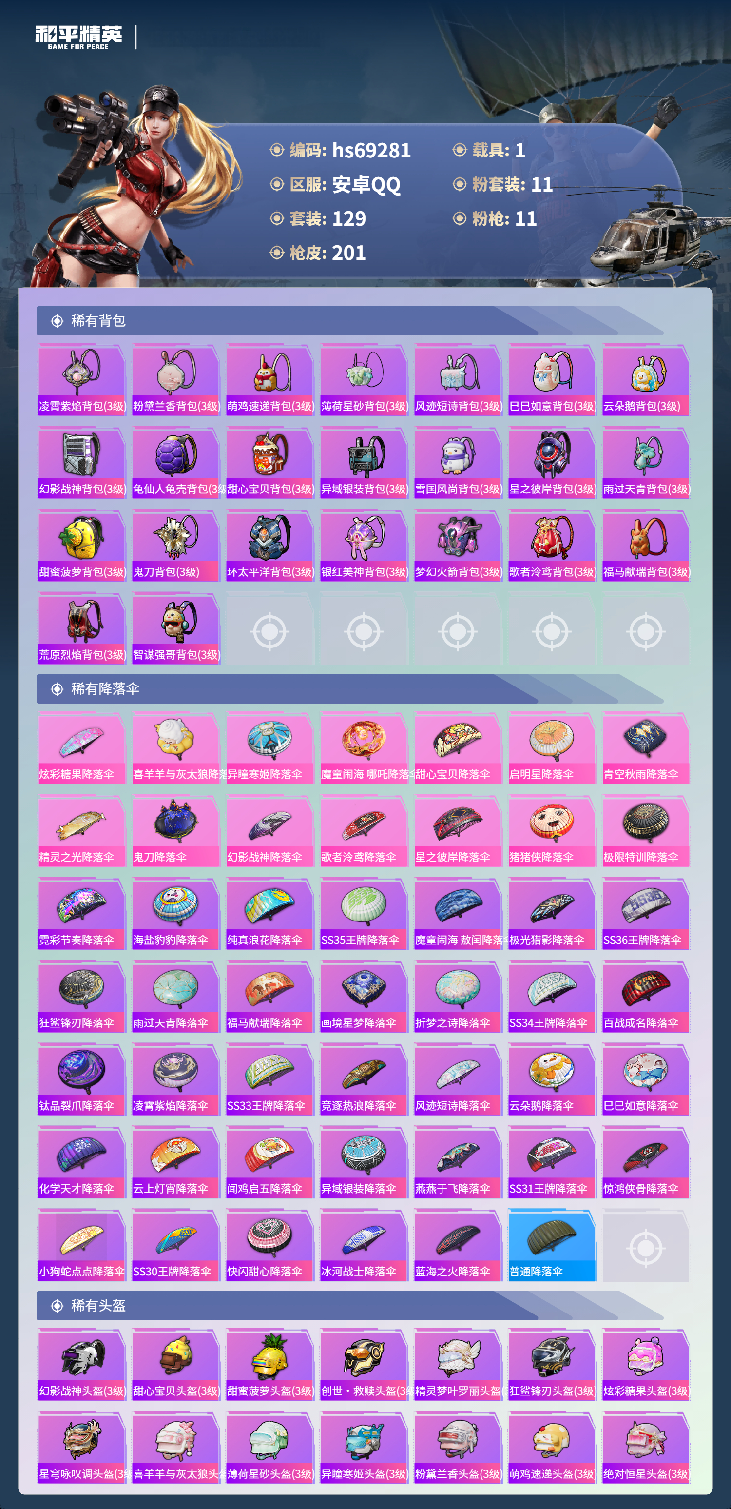 hs69281 安卓手Q-10王牌印记-11粉装-11特效枪-1载具-61907热力值-129套装-201枪皮-1卓越印记