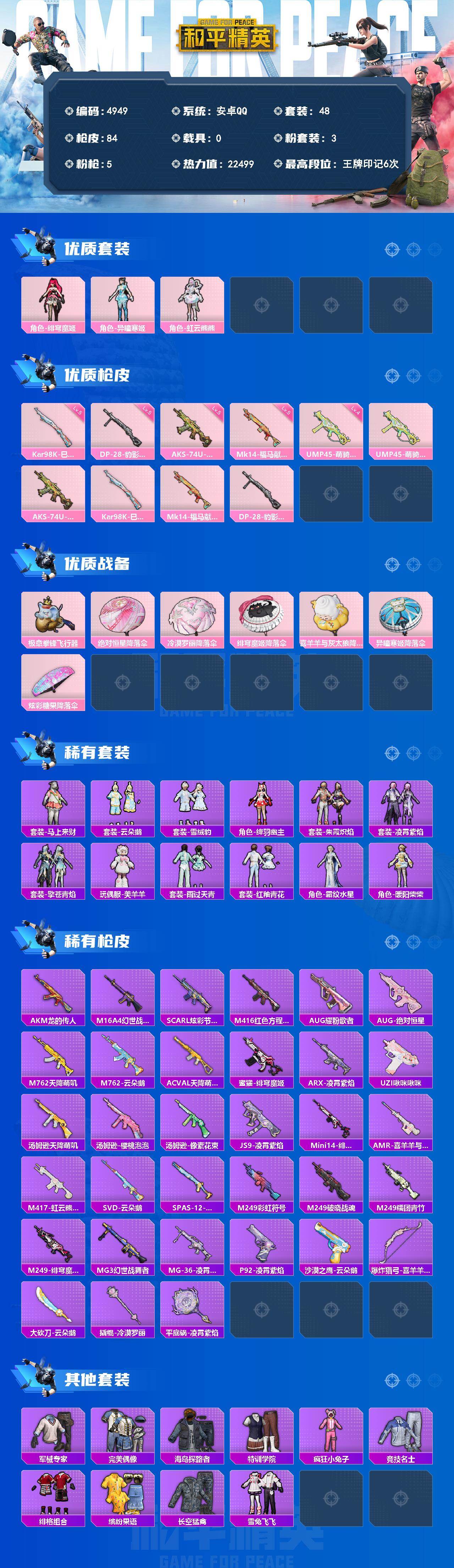 安卓 手Q-3粉装-5特效枪-0载具-1粉色飞行器-22499热力值-6王牌印记-48套装-84枪皮
