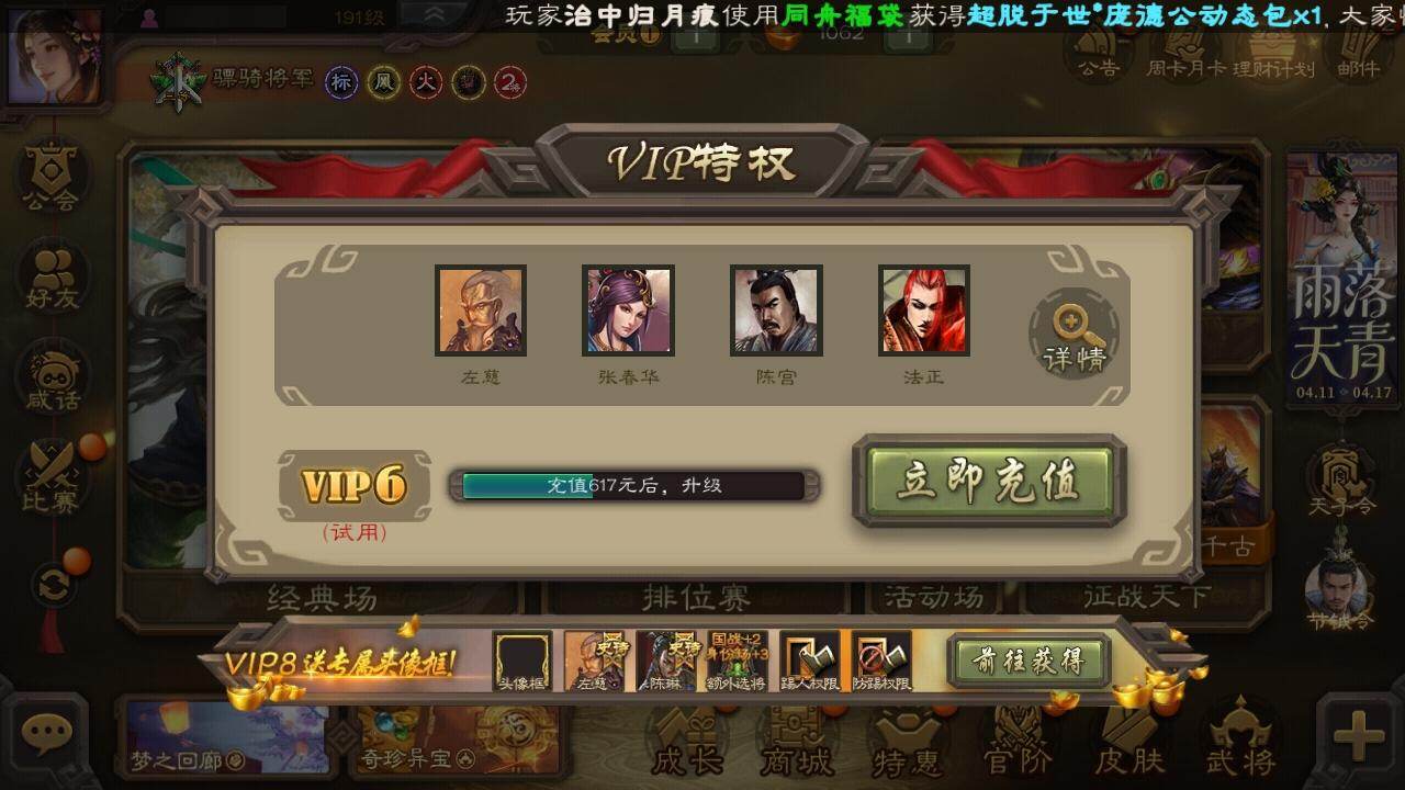 官阶:骠骑将军 VIP等级:VIP6级 史诗武将数:20 动态皮肤数:4 武将