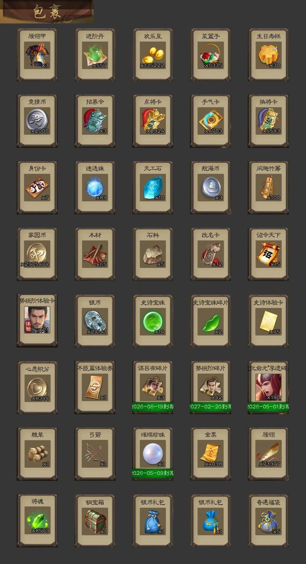 官阶:大将军;VIP等级:VIP13;史诗武将数量:67;动态皮肤数量:60;武将总数:444;史诗宝珠数量:14;将魂数量:8579;神将:10;魏国史诗武将:36;蜀国史诗武将:14;吴国史诗武将:12;群史诗武将:19