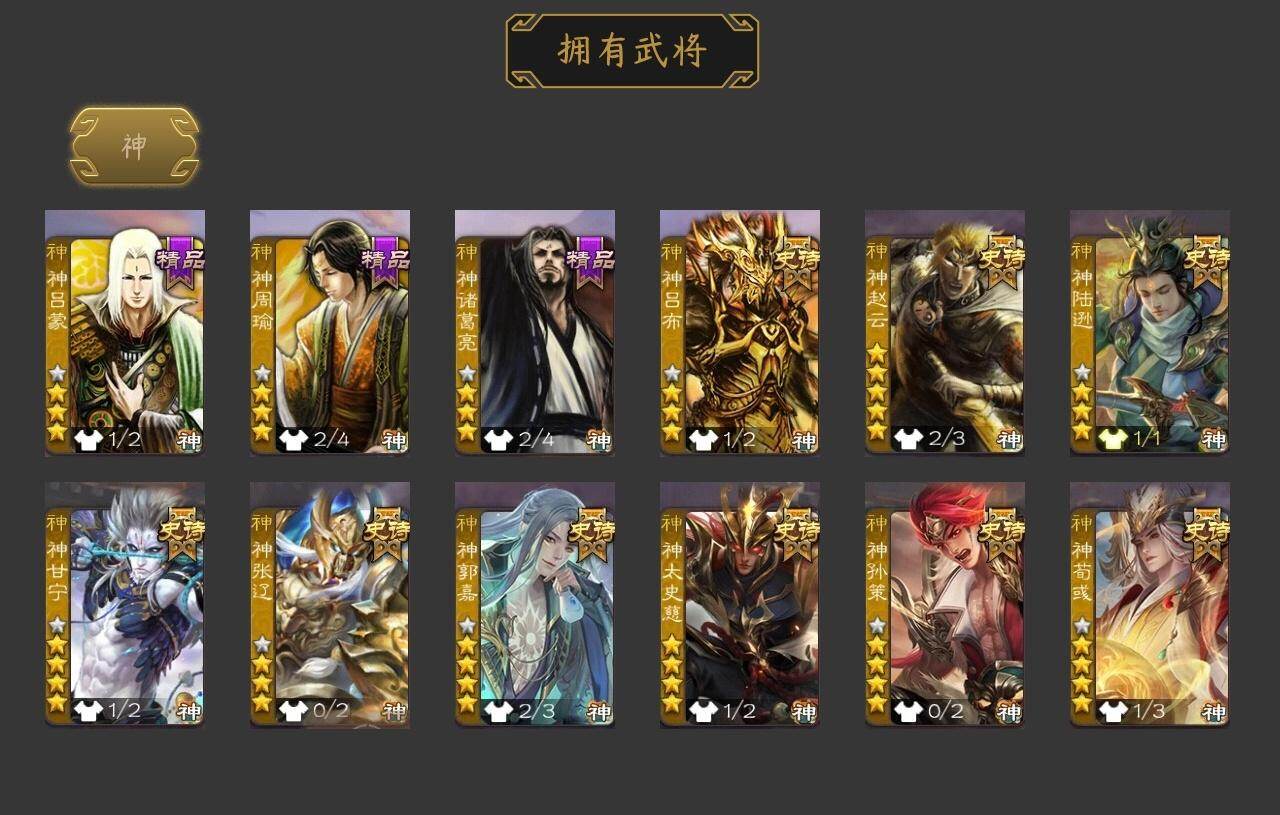 神吕布,神赵云,神陆逊,神甘宁,神张辽,神郭嘉,神太史慈,神孙策,神荀彧,神诸葛亮,星周不疑,王粲,杨修,王元姬,马钧,界钟会,界于禁,界曹真,嵇康,郝昭,陈琳,曹纯,戏志