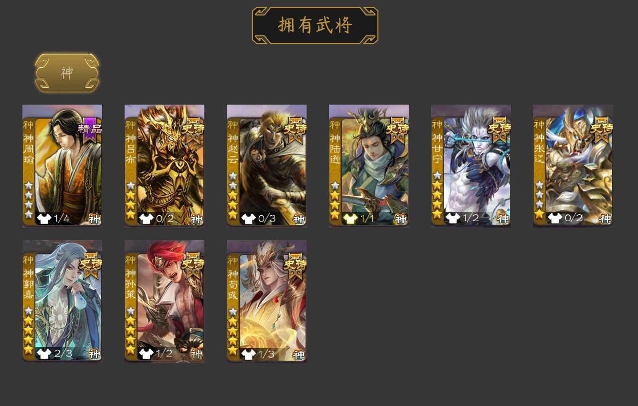 神吕布,神赵云,神陆逊,神甘宁,神张辽,神郭嘉,神孙策,神荀彧,杨修,王元姬,王凌,界钟会,界曹真,郝昭,陈琳,曹纯,戏志才,谋夏侯惇,程昱,马云騄,谋黄忠,谋夏侯氏,谋马超,周群,赵襄,张星彩,王平,沙摩柯,谯周,花鬘,吴景,孙皓,骆统,留赞,界朱然