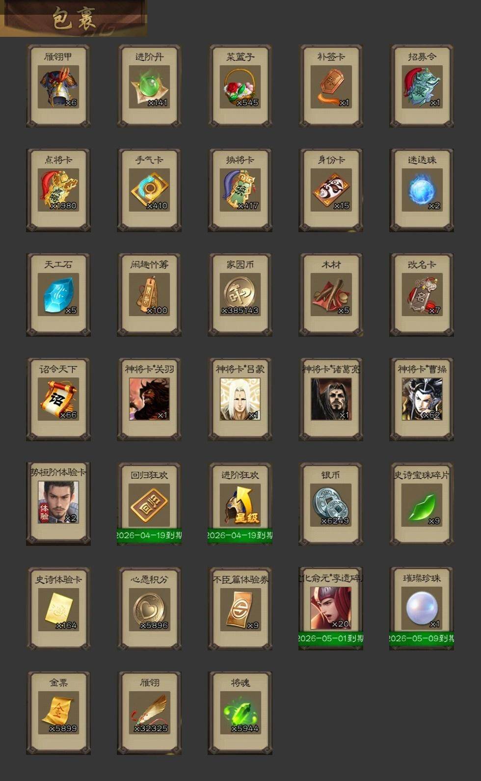 官阶:大将军 VIP等级:VIP11级 史诗武将数:49 动态皮肤数:35 武将总数:395 史诗宝珠数:0 元宝数:173 将魂数:5944