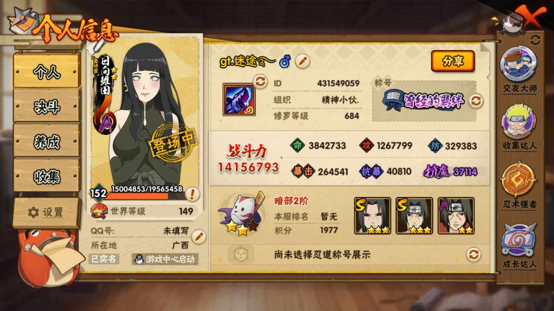 (可免费转苹果)v7 21S 48A 1415w战力 十尾带土87片 鬼灯幻月80片 大野木59片 仙人兜68片 热门A忍:百豪樱 1个主场景:博人传 26张招募券 34661金币 AA1094