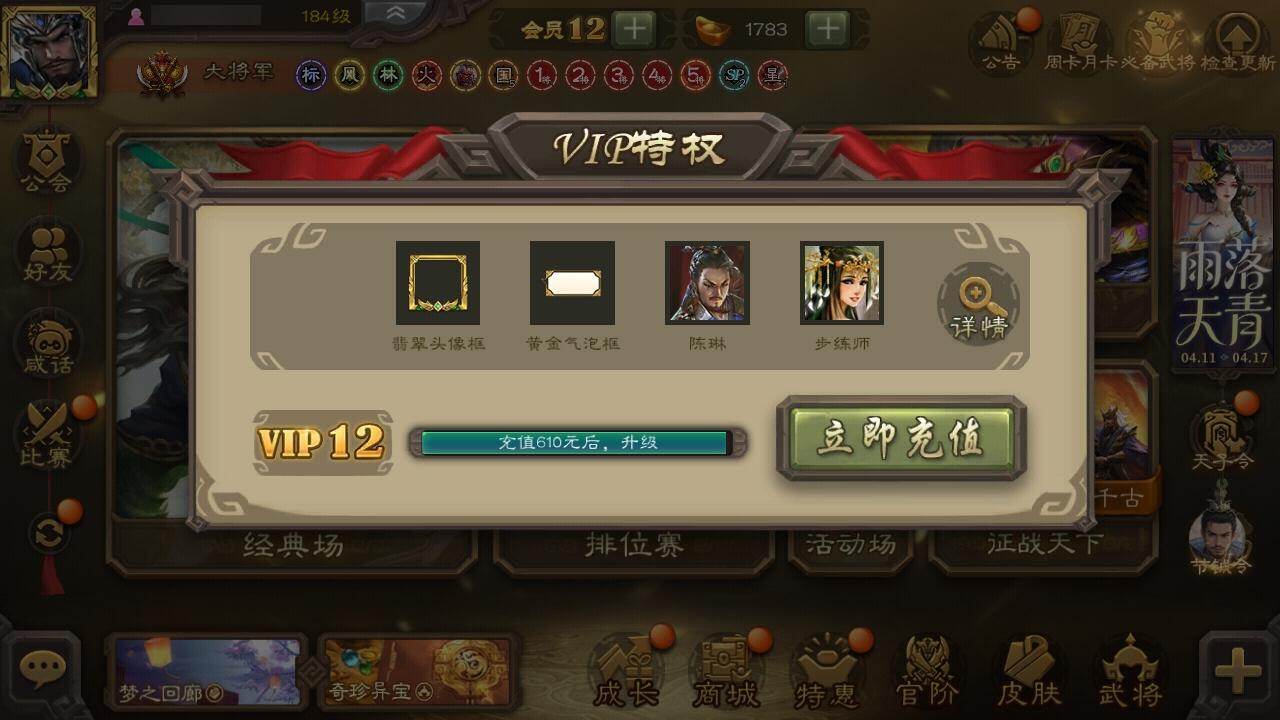 官阶:大将军 VIP等级:VIP12级 史诗武将数:62 动态皮肤数:51 武