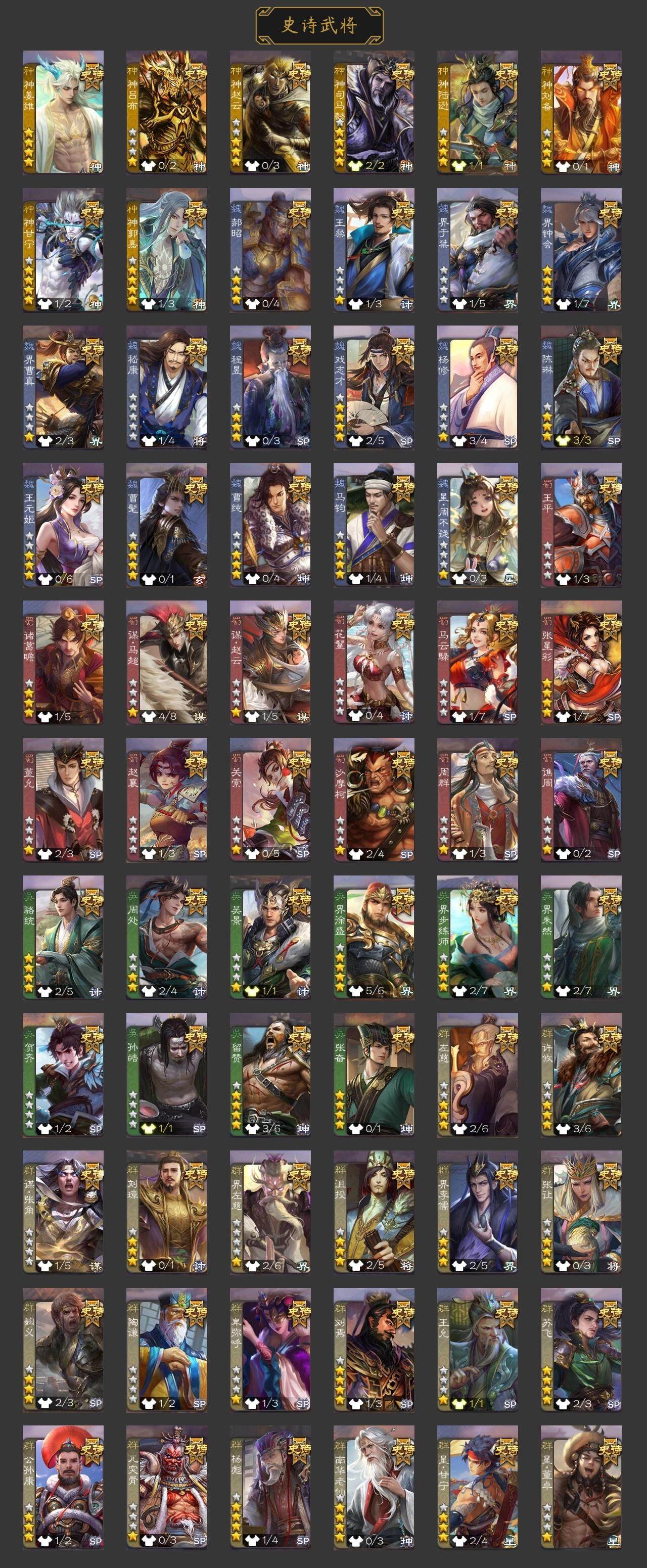 神赵云,神陆逊,神刘备,神甘宁,神张辽,神郭嘉,神孙策,神荀彧,神诸葛亮,曹髦,谋曹操,杨修,王元姬,王凌,界钟会,界曹真,嵇康,陈琳,曹婴,曹纯,戏志才,刘晔,清河公主,势辛宪英,程昱,谋诸葛亮,马云騄,谋赵云,谋马超,张星彩,沙摩柯,谯周,花鬘