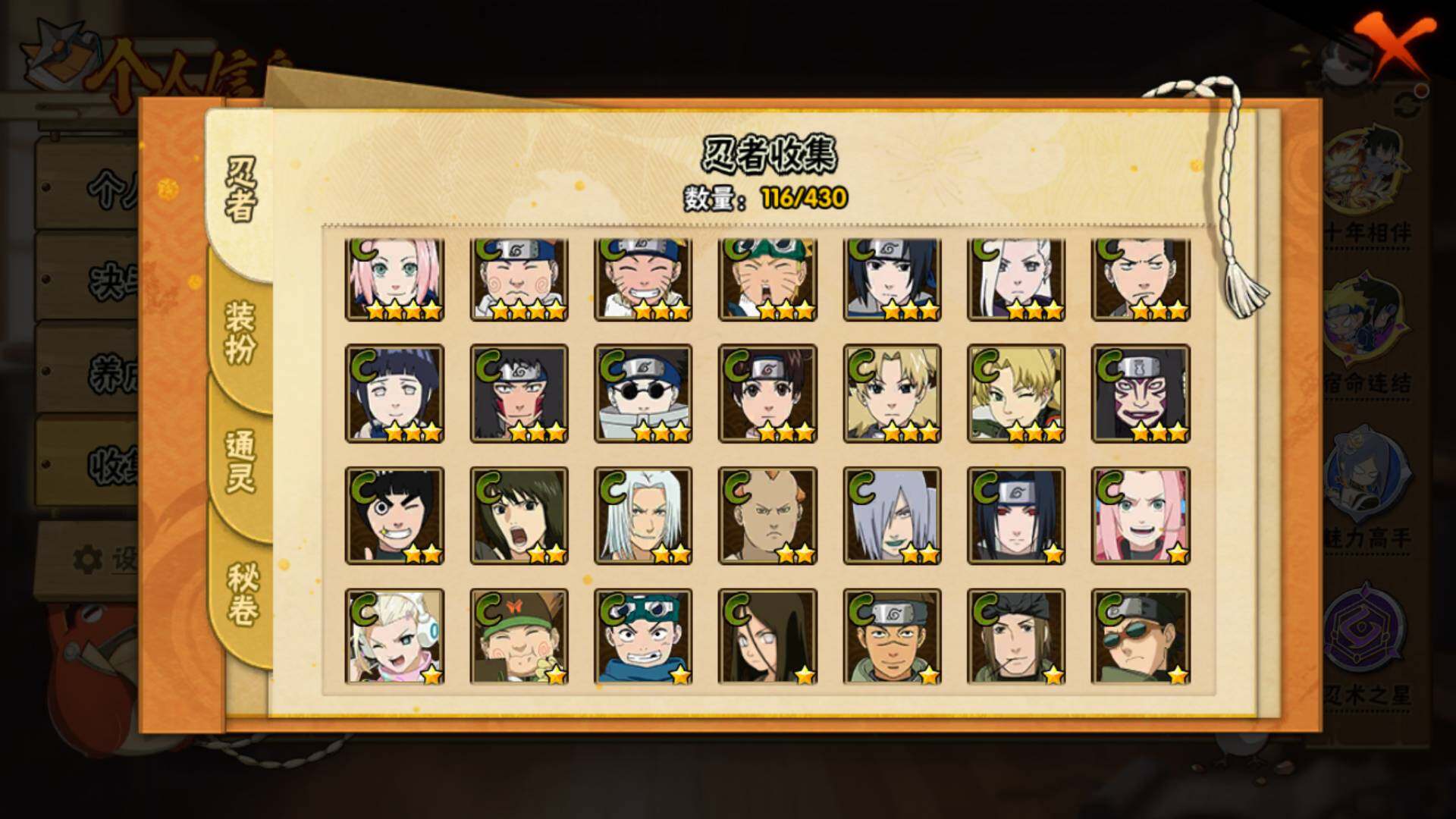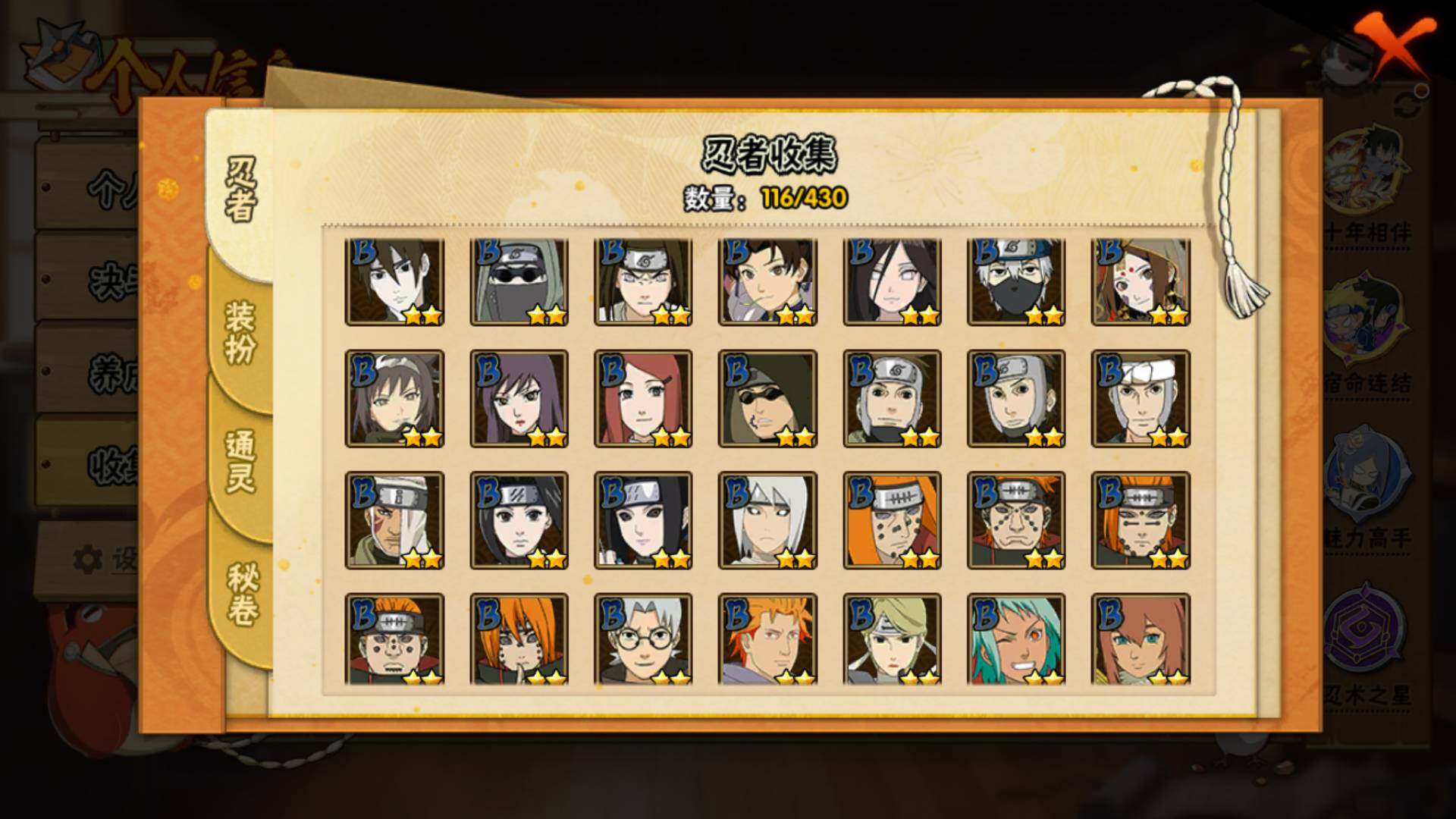 【S级忍者】:宇智波斑「秽土转生·解」(3星),宇智波鼬「须佐能乎」(3星),旗木卡卡西「须佐能乎」(3星),自来也「舞之豪杰」(3星),自来也「传说中的三忍」(3星),波风水门(3星),佩恩「天道」(3星),漩涡鸣人·宇智波佐助(3星)